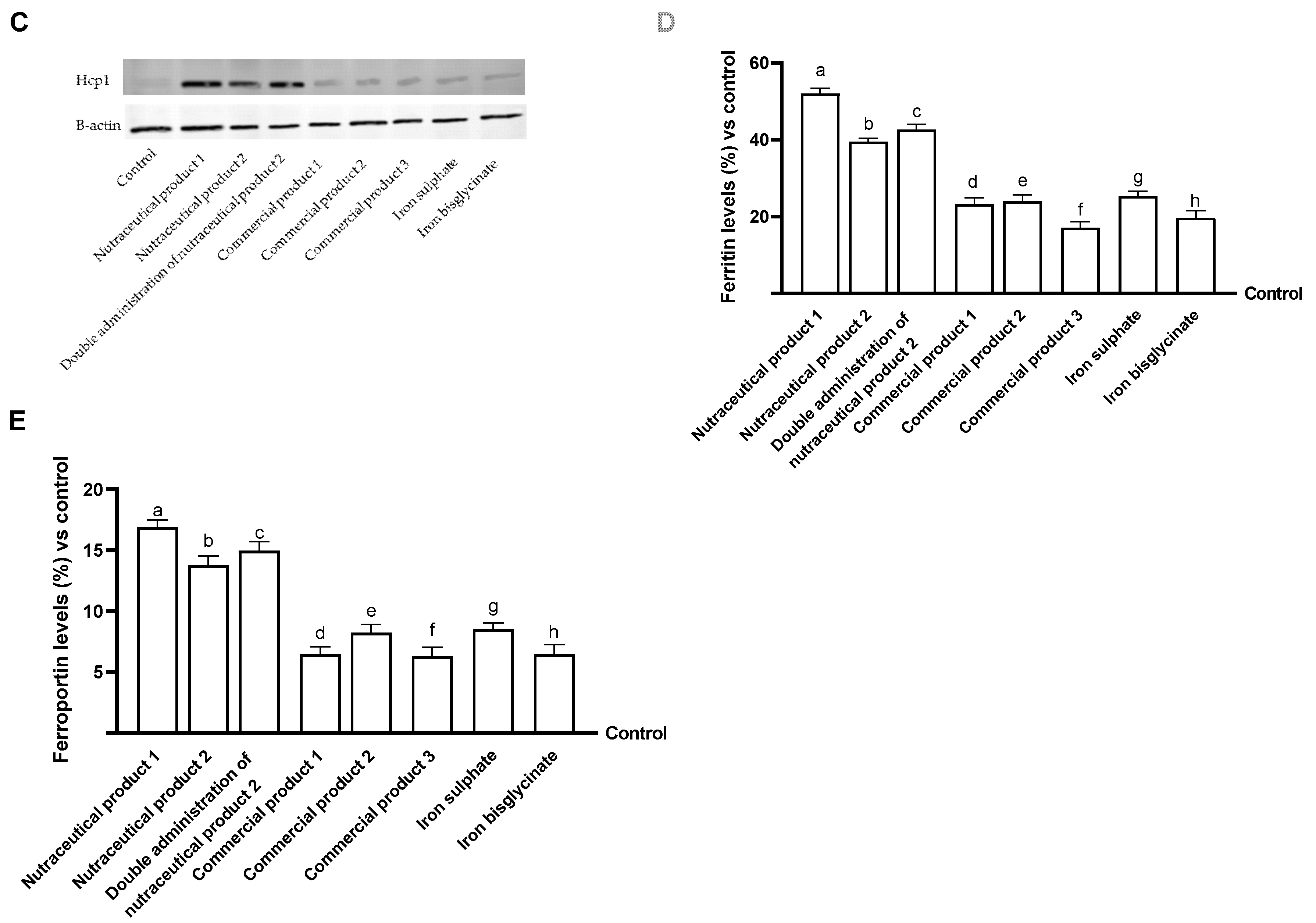 - Uberti, F.; Morsanuto, V.; Ghirlanda, S.; Molinari, C. Iron Absorption from Three Commercially Available Supplements in Gastrointestinal Cell Lines. Nutrients 2017, 9, 1008. [Google Scholar] [CrossRef]