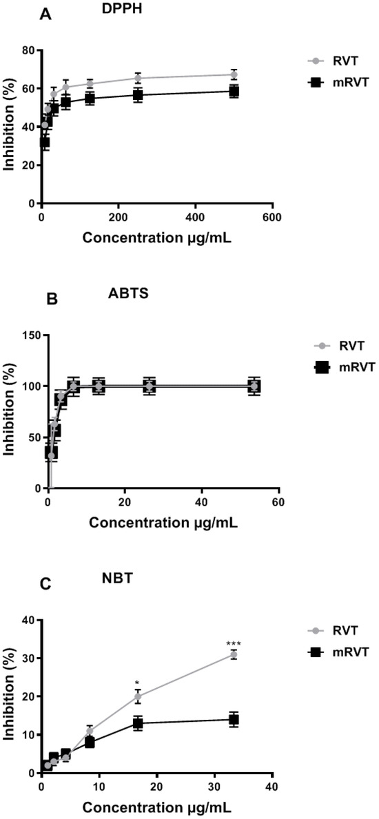 | Ferric-Reducing Power Assay of RVT and mRVT | Copper-Reducing Power Assay of RVT and mRVT | ||||