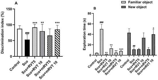 3.3.1. Effect of RVT and mRVT on Recognition Memory of Rats with Scopolamine-Induced Memory Impairment (Novel Object Recognition Test)