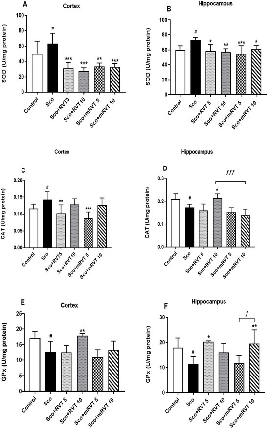 3.3.3. Effect of RVT and mRVT on SOD, CAT, and GPx Activity in the Cortex and Hippocampus of Rats with Scopolamine-Induced Memory Impairment