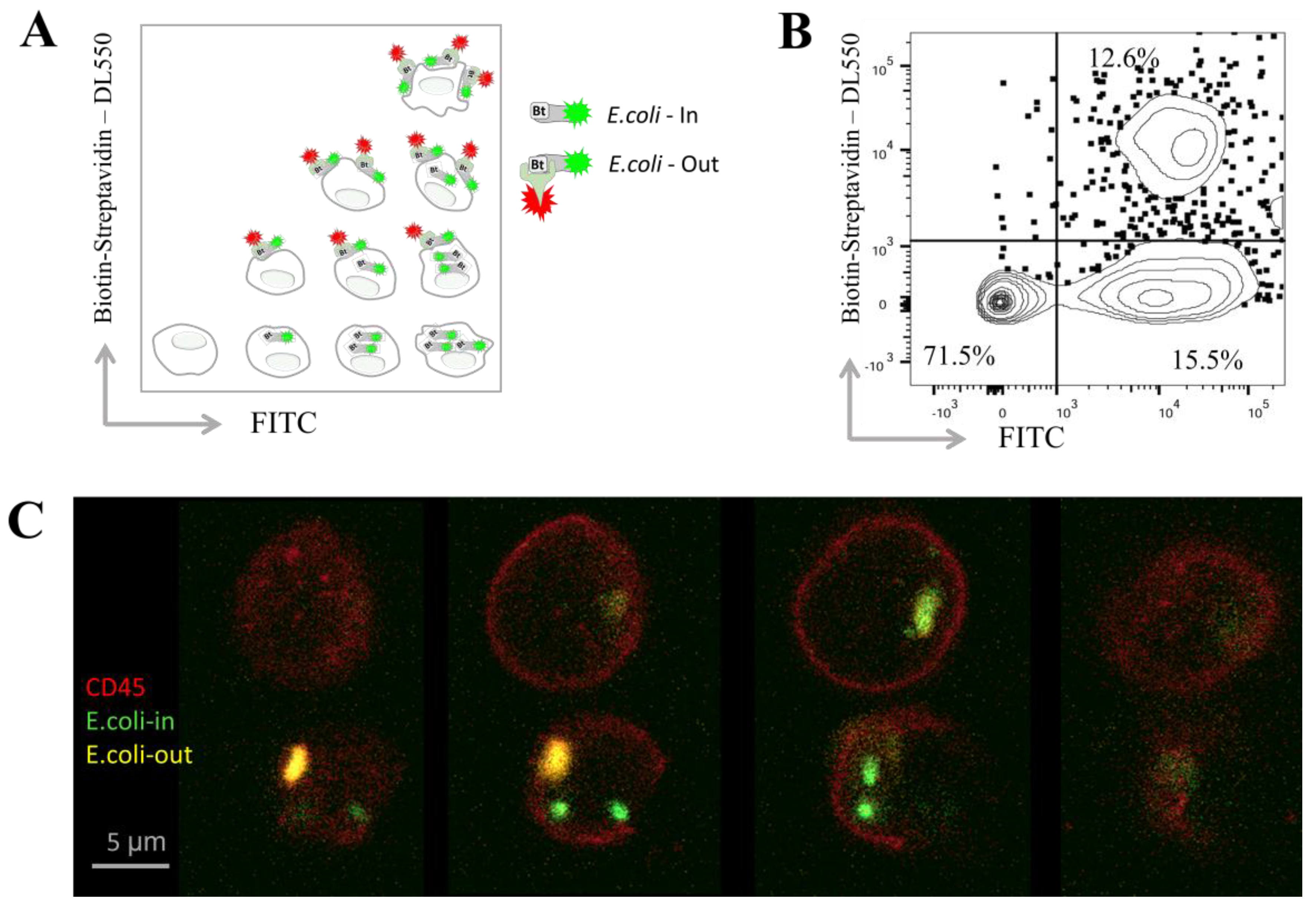 To perform confocal microscopy, myeloid blood cells before and after completion of phagocytosis, were sorted using BD FACSAria III for side scatter (SSC) and CD45-APC-eFluor780, into CD45+ population of phagocytes, as well as into a single positive and double positive population having E. coli inside or both outside and inside the phagocytes. Then the cells were used for additional antibody staining or directly for slides mounting for confocal microscopy.