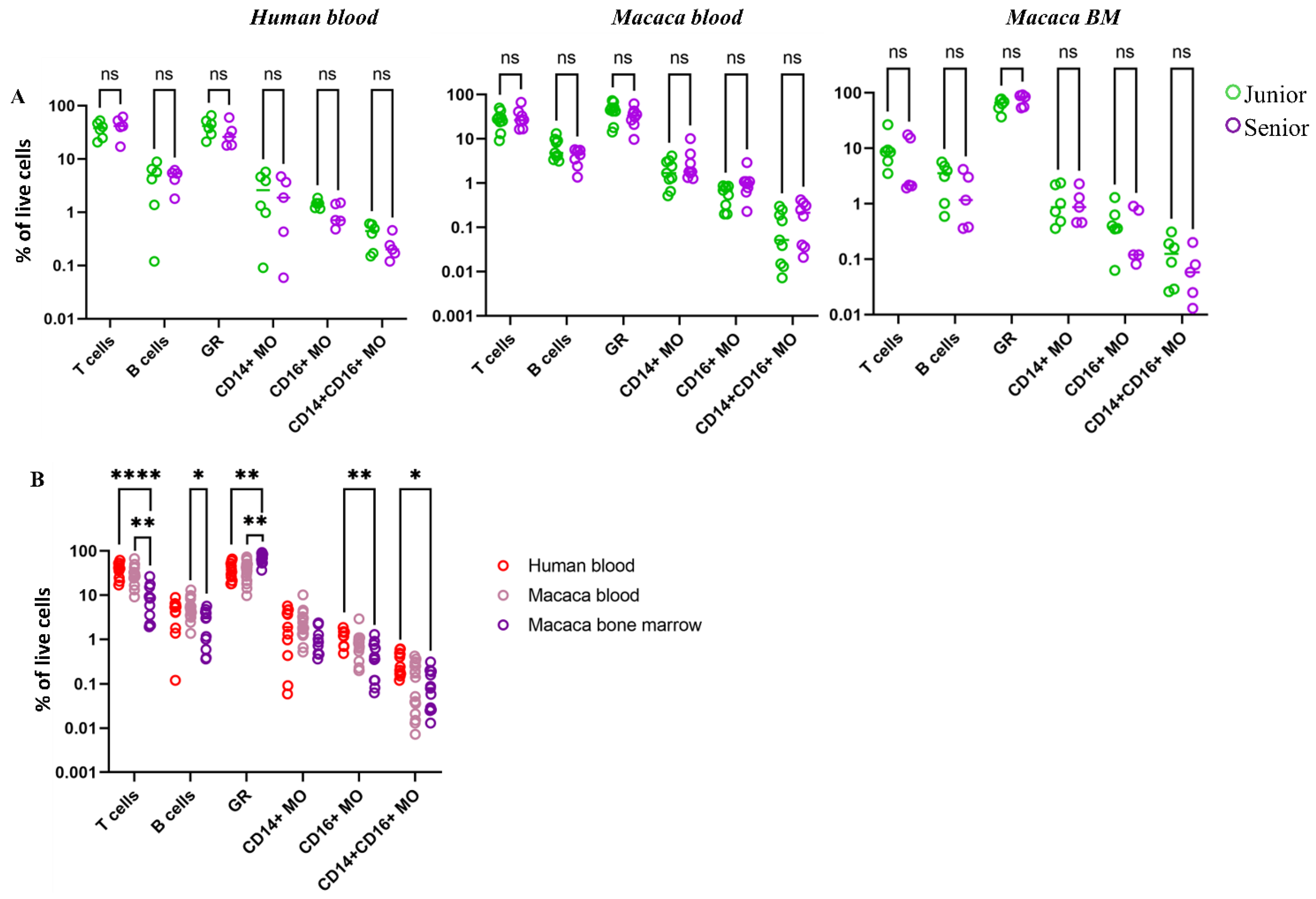 Cynomolgus monkeys are one of the most widely used models in preclinical research, making this study relevant for a broad range of biomedical scientists. A comparison of myeloid populations in blood samples from humans and cynomolgus monkeys, including a previously unstudied group of elderly macaques over 20 years of age, revealed both interspecies similarities and differences in cellular aging processes among primates.
