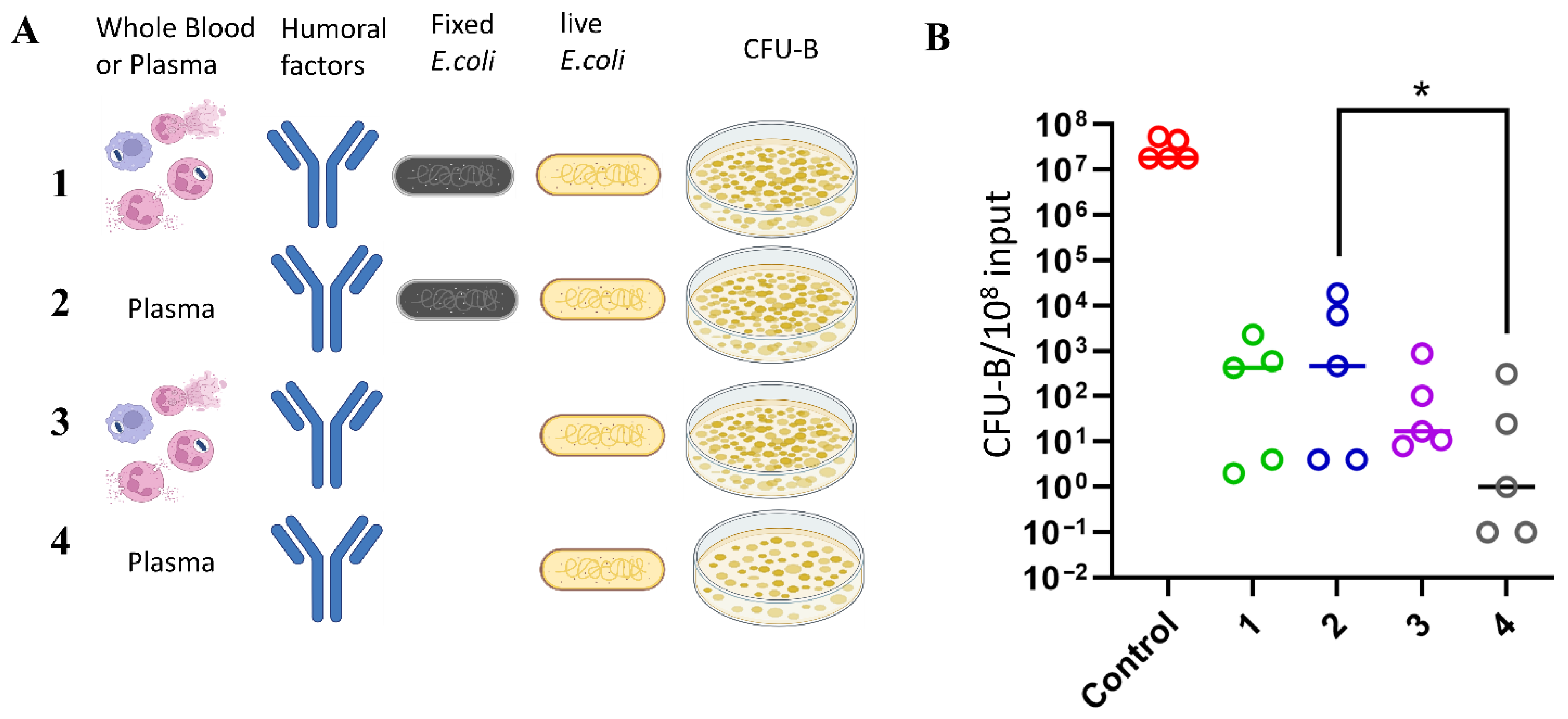 In conclusion, we found a predominance of humoral factors over cellular factors in antimicrobial defense (against E. coli, strain DH5α). The uniqueness of our approach is in the simultaneous assessment of both cellular and humoral blood functions, which enables a better understanding of how the immune system combats various bacteria—specifically, whether they are sensitive or insensitive to complement. Thus, the developed protocols can be used for any strain to comprehensively understand the role of cellular and humoral factors in various infectious diseases and infectious immunity in general.