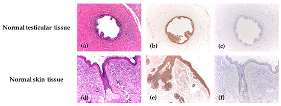 For each antibody, positive and negative control markers for the immunohistochemical reaction were used. For positive control reactions, two categories of normal tissues routinely available in the Pathology Department were selected and processed as dedicated control blocks. In accordance with the control tissues specified in the data sheet, the positive control for ALDH1 was the normal testicular tissue, where a specific cytoplasmic marker was identified, and for Maspin, the positive control was identified in normal skin tissue, where the antibody showed both nuclear and cytoplasmic markers. Skin and testicular tissues were chosen based on their consistent immunoreactivity profiles and confirmed absence of inflammatory, dysplastic, or other histopathological alterations. Immunohistochemical staining with ALDH1 was carried out similarly for the negative control, but tris buffer was used instead of the primary antibody. The primary antibody was omitted for the negative control in immunohistochemical staining with Maspin (Figure 1).