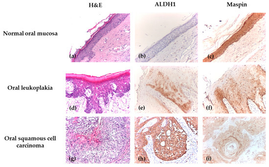 The immunoexpression profiles of ALDH1 and Maspin revealed fundamentally opposite patterns in OPMDs compared to normal epithelium, suggesting their potential involvement in early oral carcinogenesis. Representative morphological features on hematoxylin–eosin (H&E) staining and immunohistochemical expression patterns of ALDH1 and Maspin in normal oral epithelium and oral lesions are illustrated in Figure 2.