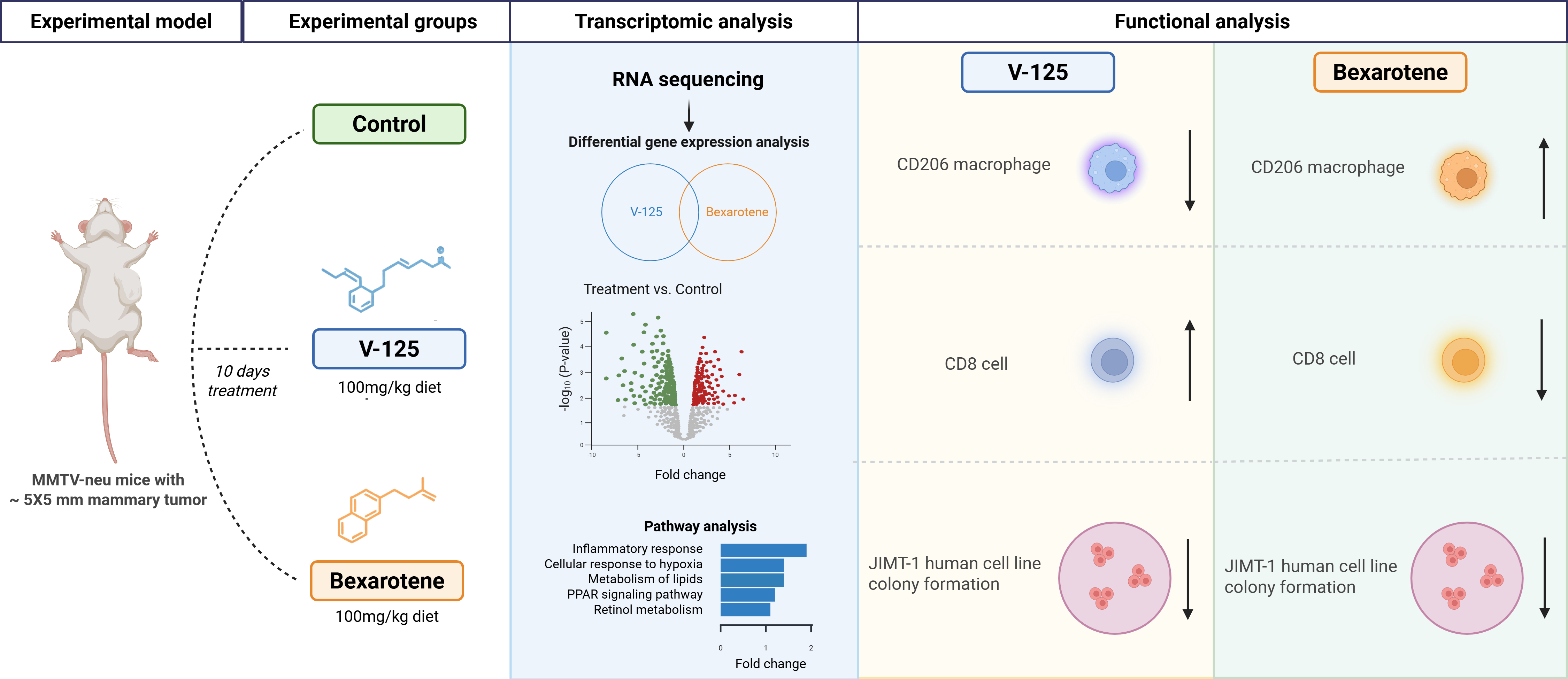 Chowdhury AS, Reich LA, Liby KT, Yeh ES, Leal AS. RXR Agonist V-125 Induces Distinct Transcriptional and Immunomodulatory Programs in Mammary Tumors of MMTV-Neu Mice Compared to Bexarotene. Biomedicines. 2026; 14(1):80. https://doi.org/10.3390/biomedicines14010080