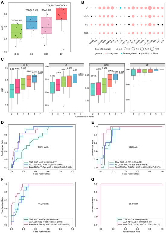 Differential concentration analysis and discrimination of serum bile acids between healthy individuals and patients with HBV-related diseases. (A) Average AUC values of 15 individual bile acids for distinguishing health status and disease status via GBDT. Individual AUC values are shown as points, with the maximum value highlighted in color. (B) Analysis of the differences in the concentrations of individual bile acids with respect to health and disease. Upregulated: p < 0.05, fold change (FC) > 2; downregulated: p < 0.05, FC < 0.5; none: p > 0.05. (C) AUC distributions for the cumulative combinations of bile acids used to distinguish health and disease status via GBDT, with the numbers indicating the maximum average AUC values for each combination. (D–G) Discriminator ROCs of the combined bile acids to distinguish health and diseases with ALT, AST, and TBA as the references.