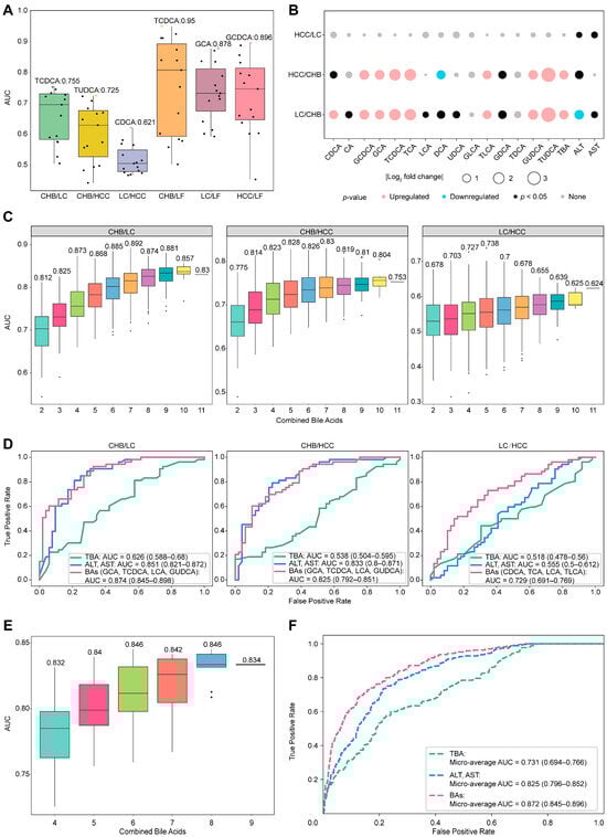 Serum bile acids were further evaluated as indicators to distinguish HBV-related liver diseases subtypes. Employing a strategy consistent with prior analyses, mean AUC values of individual bile acids were stratified into three tiers (Figure 3A): (1) good discriminators (AUC ≥ 0.8) in CHB/LF, LC/LF, and HCC/LF; (2) moderate discriminators (AUC 0.7–0.8) in CHB/LC and CHB/HCC; and (3) poor discriminators (AUC ≤ 0.7) in LC/HCC. Single bile acids effectively distinguished LF from others, but showed limited sensitivity in differentiating CHB, LC, and HCC, necessitating the investigation of bile acid combinations for enhanced discrimination.