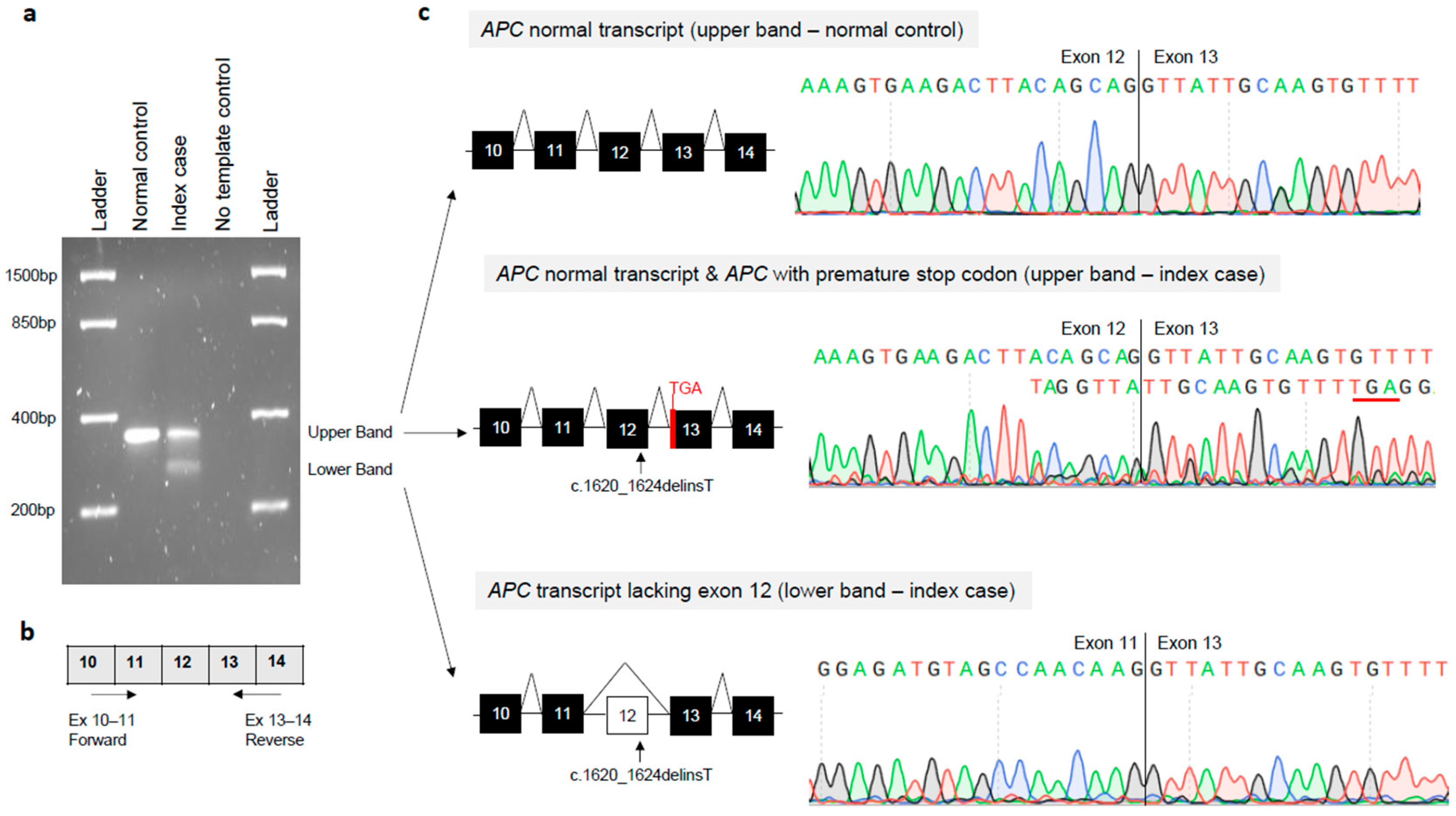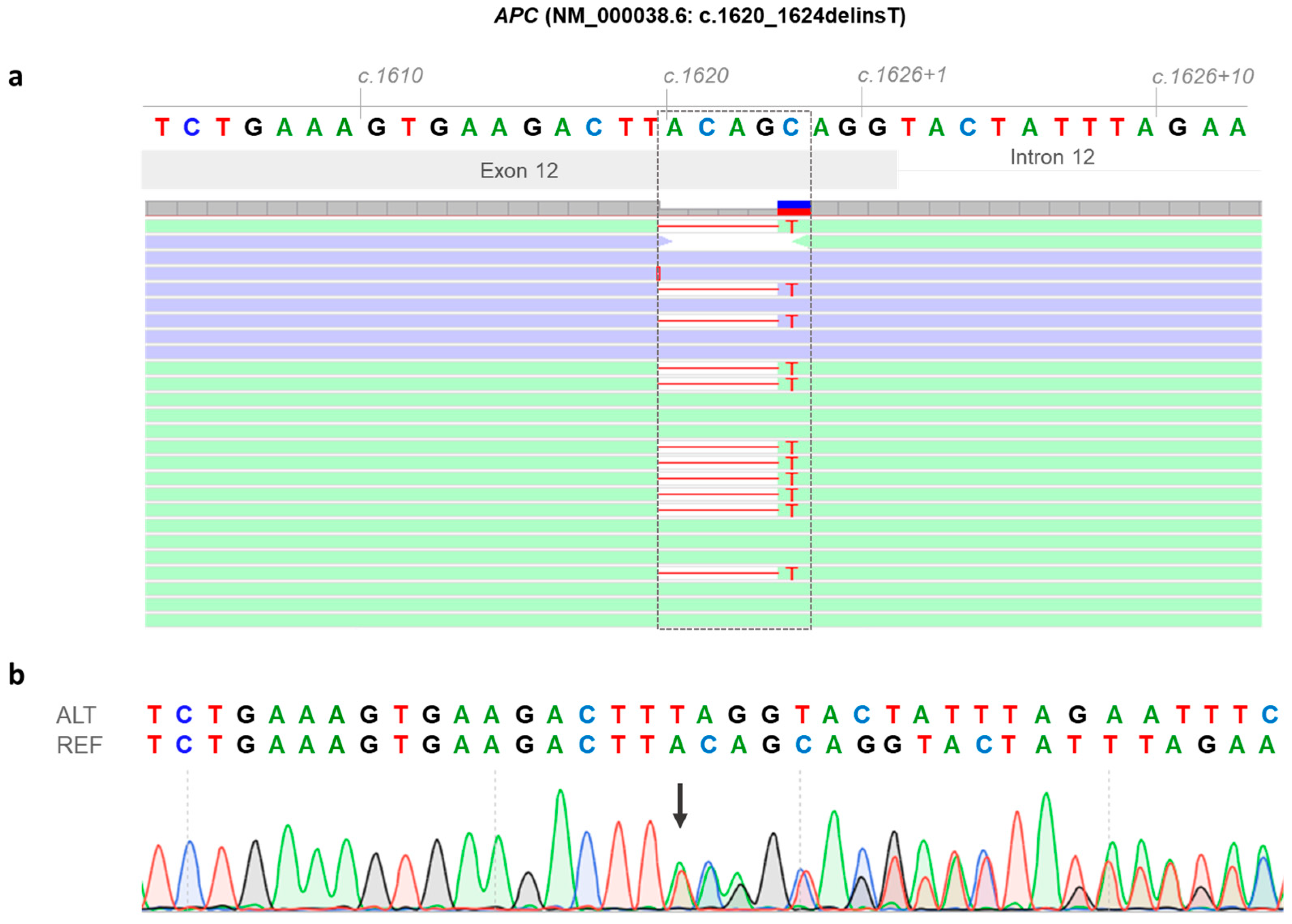 3.2. Identification of a Novel APC Germline Variant (NM_000038.6: c.1620_1624delinsT)