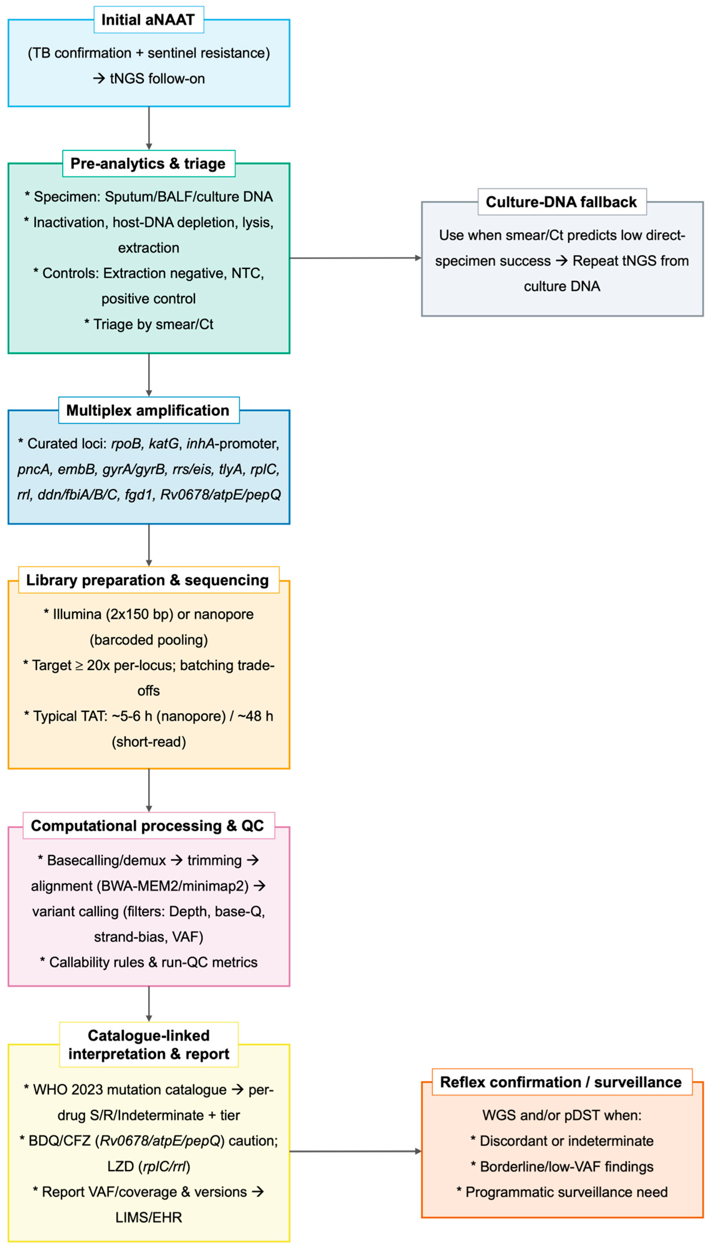 - No-call (drug-specific callability failure): It would be useful for reports to indicate the reason (e.g., insufficient gyrA coverage); repeating tNGS on a fresh specimen or culture DNA and/or pursuing pDST/WGS may be considered.