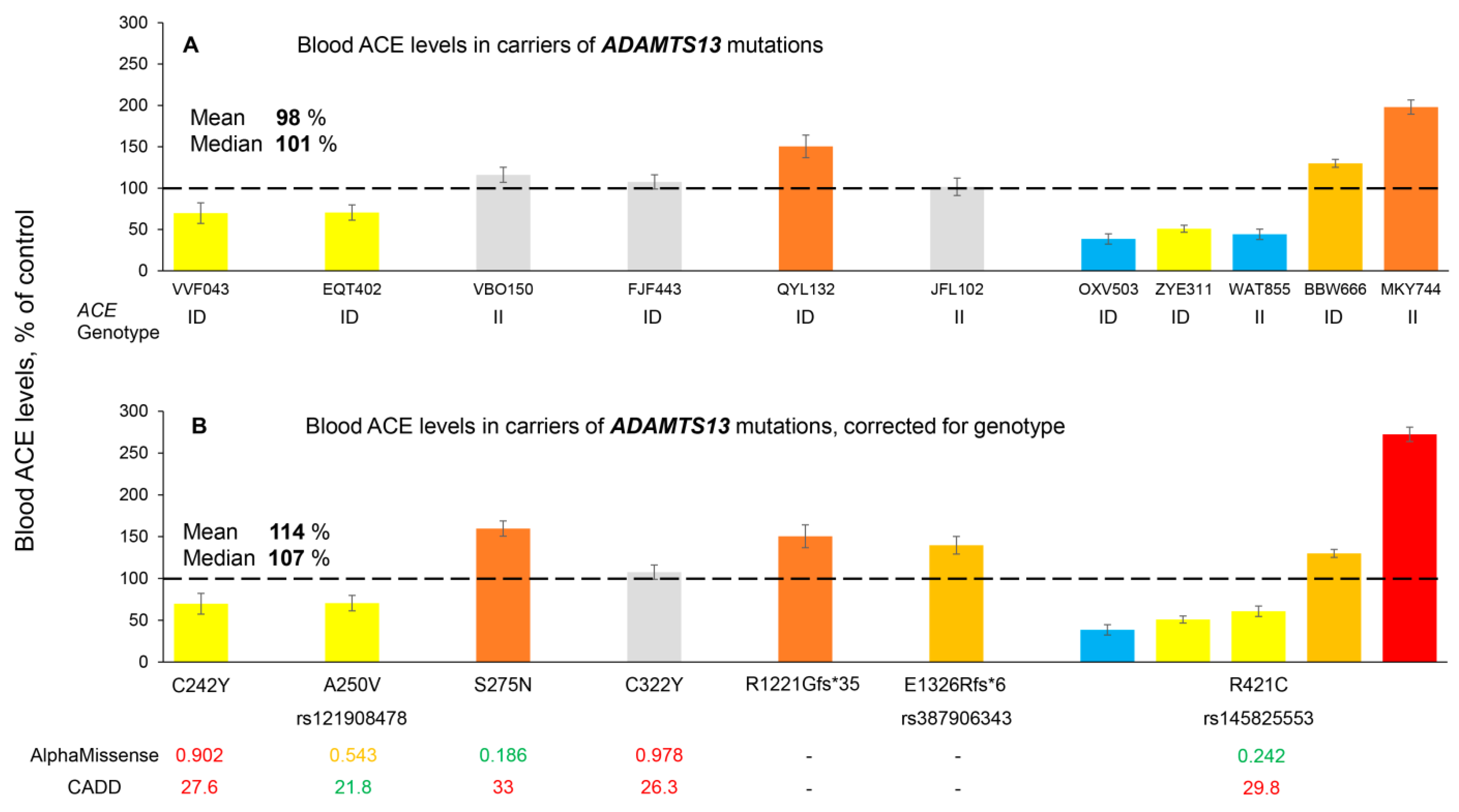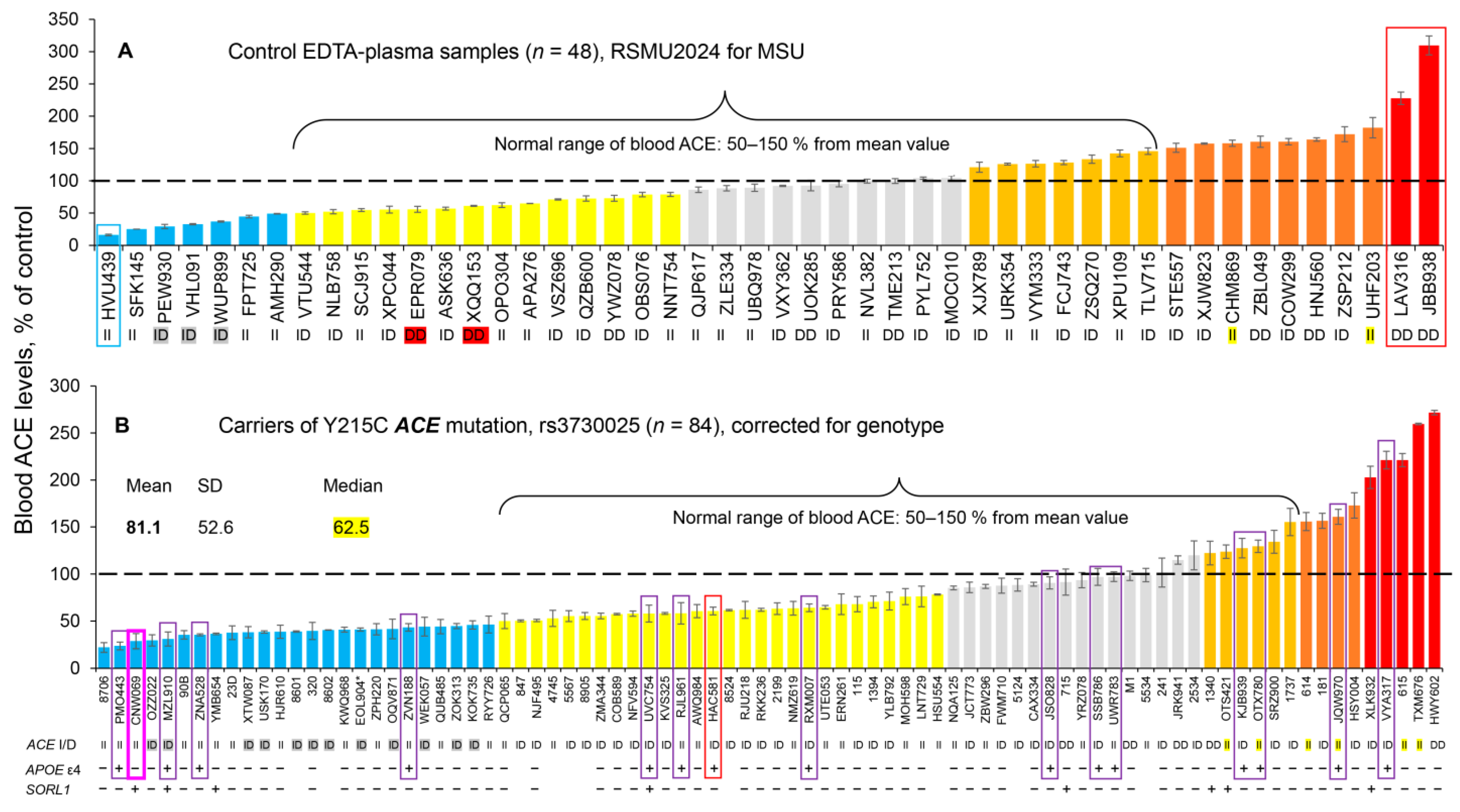 - The presence of this damaging ACE mutation, Y215C, does not guarantee a low level of ACE in the subject. Blood ACE phenotyping and analysis of WES also should be performed to identify patients with false-negative or -positive blood ACE to avoid inaccurate conclusions about the risk for ACE-dependent AD in carriers of this ACE mutation.
