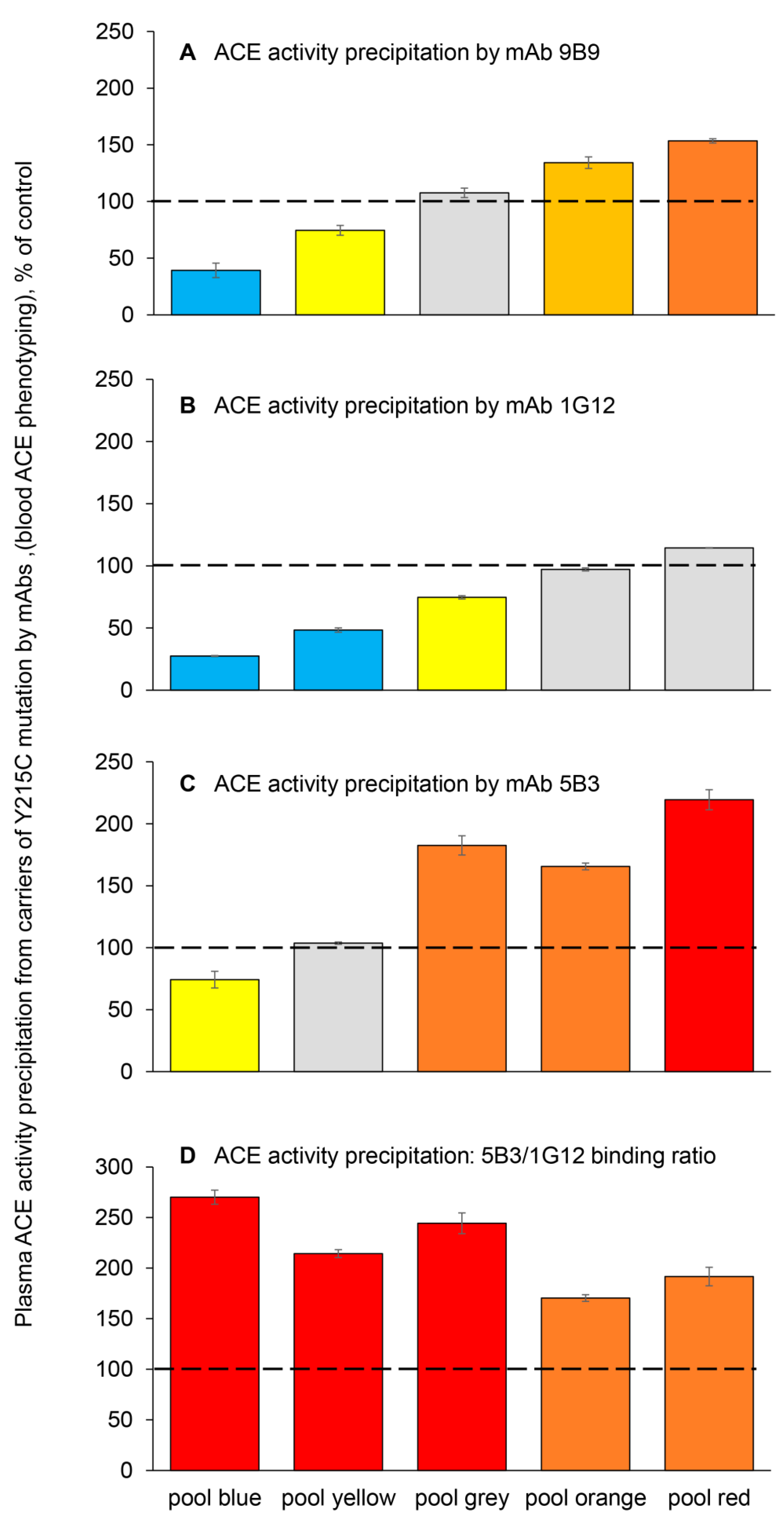 - The precipitation of ACE activity from EDTA-containing plasma obtained from 84 carriers of the Y215C ACE mutation (using the strong mAb 9B9 to ACE) demonstrated that a significant portion of these carriers had decreased ACE levels in the blood. Thus, they could be considered at increased risk for late-onset AD. The mAbs 5B3/1G12 binding ratio was revealed as a sensitive marker for the circulating Y215C ACE mutant.