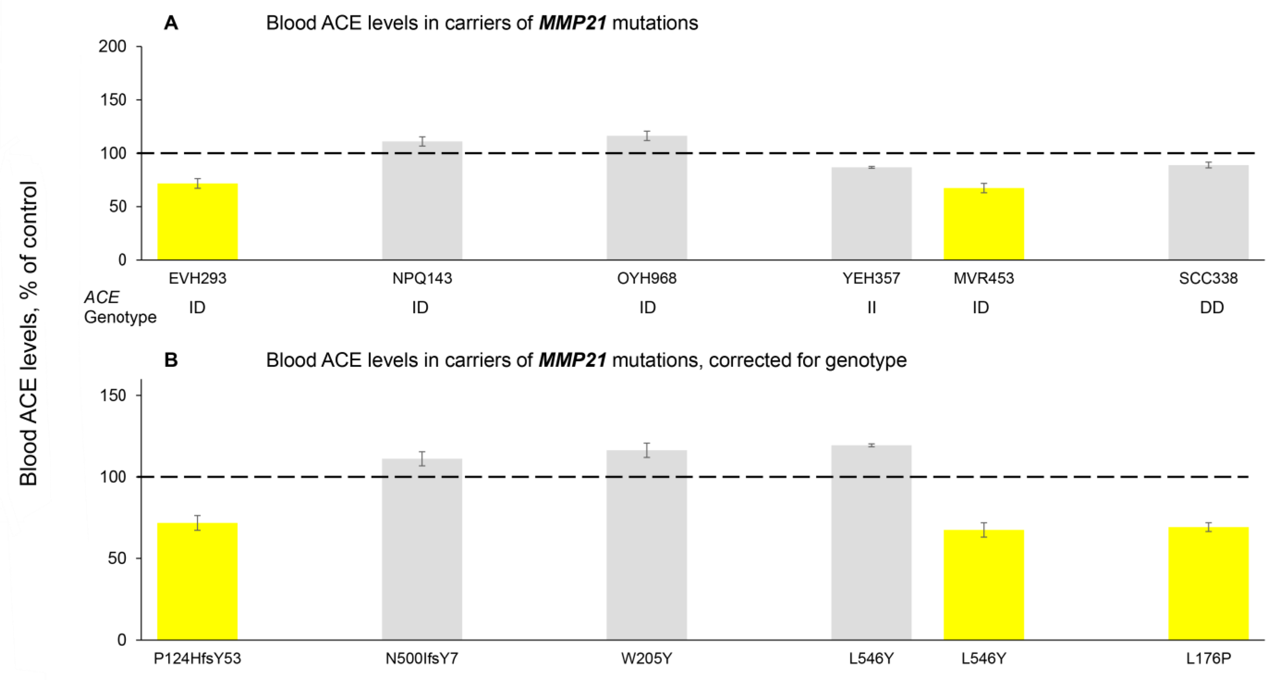 - Some carriers of the Y215C ACE mutation demonstrated significant heterogeneity in blood ACE levels. This observation indicates that information about mutations in other genes that can influence ACE shedding should also be obtained for a given individual. Otherwise, blood ACE values could be misleading, as false-negative or false-positive.