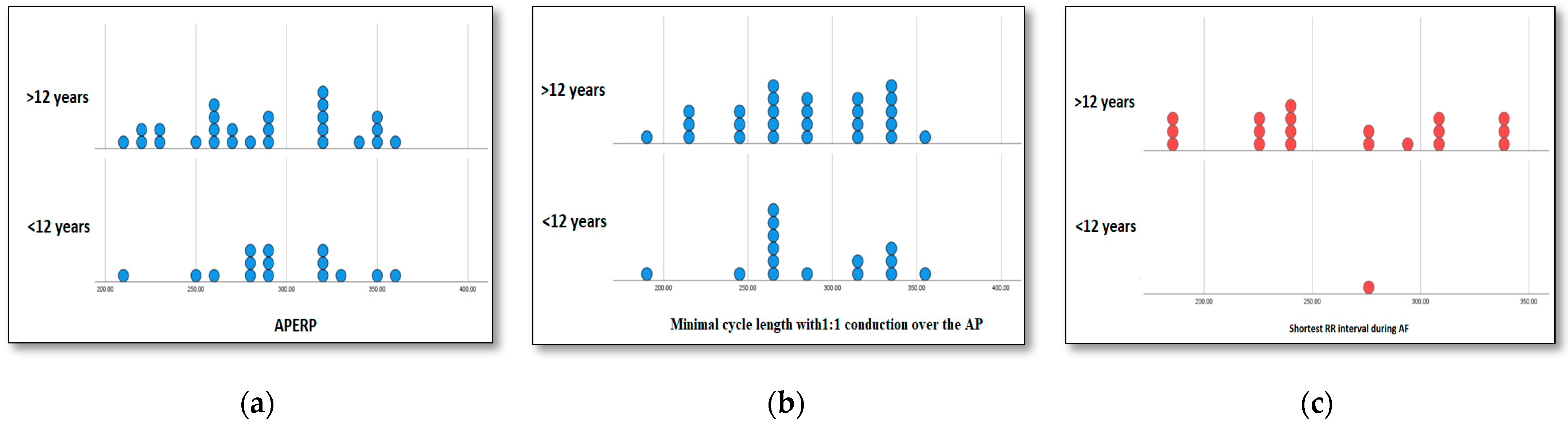 Several technical limitations must be acknowledged in our low-number cohort of children: (1) The precise measurement of the APERP is occasionally unachievable because the left atrium becomes refractory prior to the block in the accessory pathway. (2) The APERP changes with the cycle length. A fixed rate of 500 ms was used; however, the most valid APERP measurements would potentially be established at cycle lengths similar to those seen in orthodromic reentrant tachycardias. (3). We collected our APERP and minimal cycle duration with 1:1 conduction on a 10 ms scale, since we applied extrastimuli at 10 ms decrement. However, while determining the shortest RR interval during AF, more accurate measurements were obtained utilizing calipers with a 1 ms scale. (4). The use of Propofol sedation in children under 12 years represents a potential confounding factor in the interpretation of the inducibility of atrial fibrillation. Sedation can alter autonomic tone and atrial electrophysiological properties, which may have contributed to the lower incidence of inducible atrial fibrillation observed in younger children. While our findings suggest age-related differences in atrial vulnerability, these results should be interpreted with caution, as the effects of sedation cannot be fully separated from the developmental differences in atrial size and electrophysiological properties. This limitation highlights the need for cautious extrapolation of these results and supports the hypothesis-generating nature of the study rather than definitive guideline-level recommendations. A better option would be Midazolam, which modulates autonomic tone and atrioventricular conduction; however, its effects on atrial vulnerability and inducibility of atrial fibrillation are modest compared to Propofol. (5) Due to the limited sample size of our study, 41 children (15 vs. 26 per group), it may offer sufficient power only for moderate to large effects but not enough power to identify minor differences between the two groups. Potentially clinically significant differences cannot be ruled out even if we found no differences between the two groups in terms of APERP, 1:1 conduction over the accessory pathway, or the shortest pre-excited RR interval during atrial fibrillation. Therefore, the lack of statistically significant differences should be viewed cautiously, and our results should be regarded as hypothesis-generating until larger, sufficiently powered studies validate them.