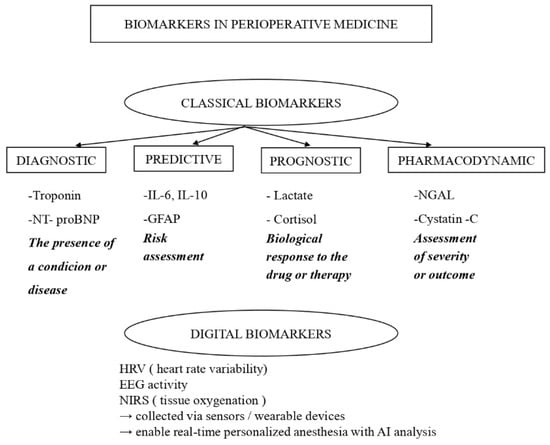 The functional classification of perioperative biomarkers into diagnostic, predictive, prognostic, pharmacodynamic, and digital categories is summarized in Figure 1.