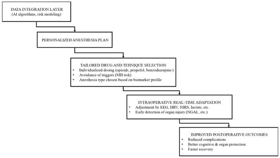 A practical workflow illustrating how integrated biomarker data and AI-based risk modeling can inform personalized anesthesia planning, intraoperative adaptation, and postoperative outcomes is presented in Figure 4.