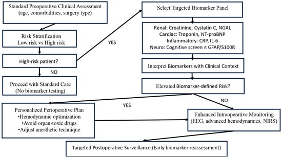 Clinical implementation of biomarkers should follow scenario-based integration within existing perioperative pathways. Biomarkers can support early risk stratification and guide preventive strategies, but should complement—not replace—clinical assessment. Embedding biomarker measurements into established frameworks enables practical and safe application in routine anesthesia care. Figure 5 illustrates a practical decision-making algorithm demonstrating how selected biomarker panels can be integrated into existing perioperative workflows to support personalized anesthesia.