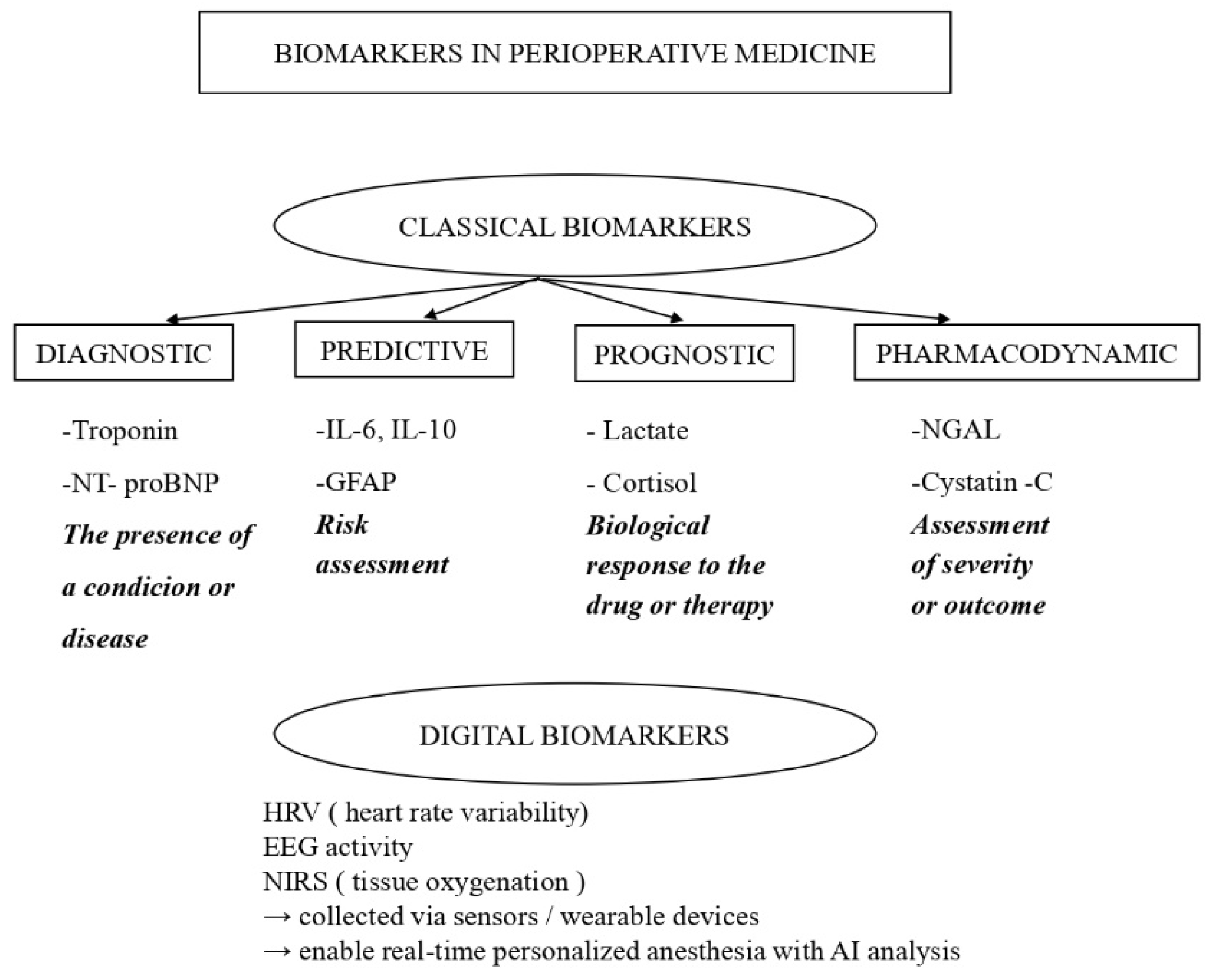 - Diagnostic biomarkers are primarily used to detect disease or subclinical organ dysfunction. In perioperative practice, well-established and validated diagnostic biomarkers include cardiac troponins or N-terminal pro-Brain Natriuretic Peptide (NT-proBNP) for myocardial injury, serum creatinine for acute kidney injury, and lactate as an indicator of global tissue hypoperfusion [6]. These biomarkers are supported by guideline recommendations and are routinely implemented in clinical workflows.