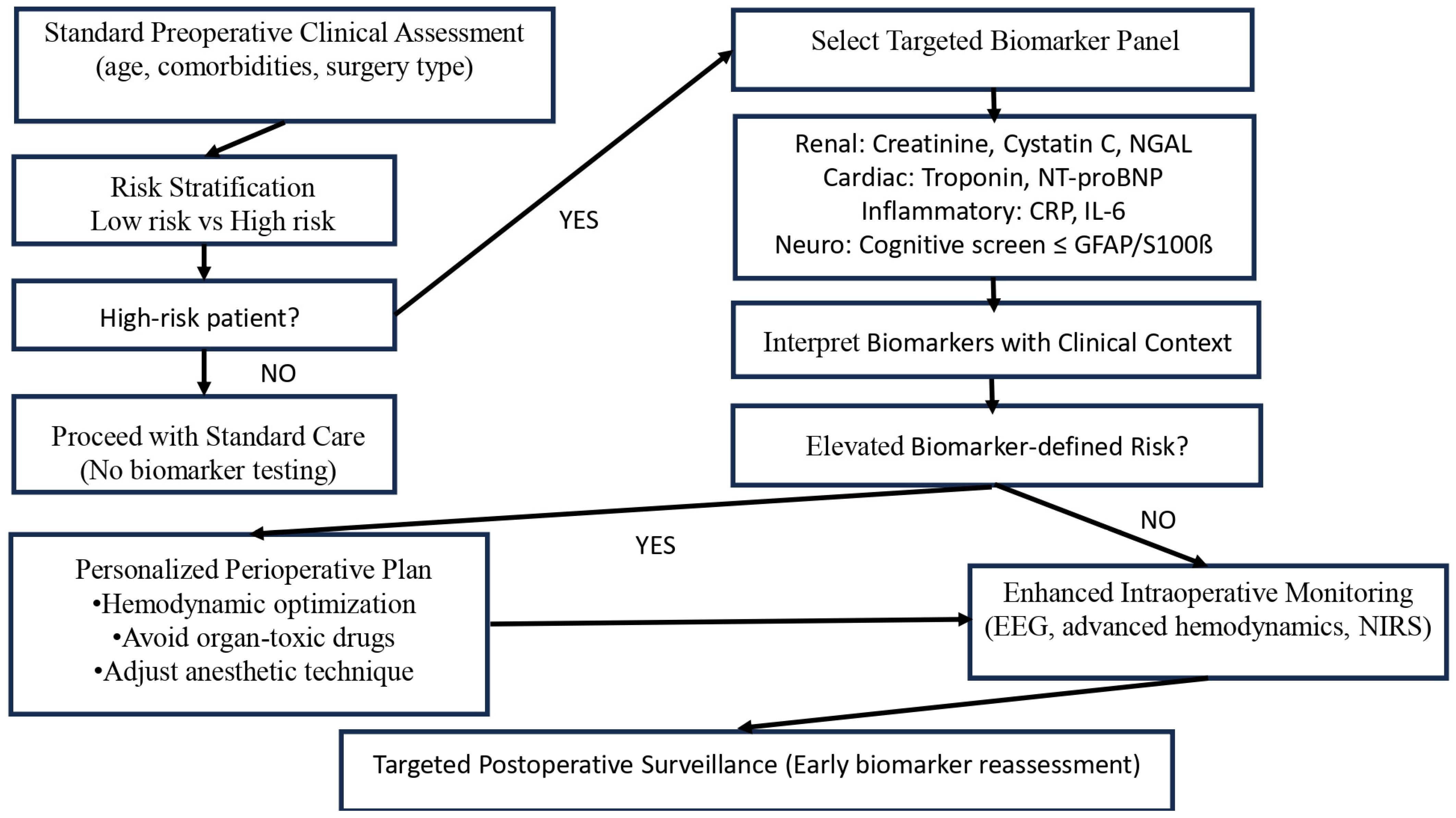 - Prognostic biomarkers provide information on disease severity or long-term outcomes. Examples include NT-proBNP for predicting postoperative cardiovascular risk, glial fibrillary acidic protein (GFAP) for neurological injury and cognitive outcomes, and NGAL and cystatin-C for renal injury [6,7,8]. While some prognostic biomarkers, such as NT-proBNP and troponin, are well validated and incorporated into perioperative risk stratification strategies, others, like GFAP, are supported by growing clinical evidence but are not yet universally standardized.