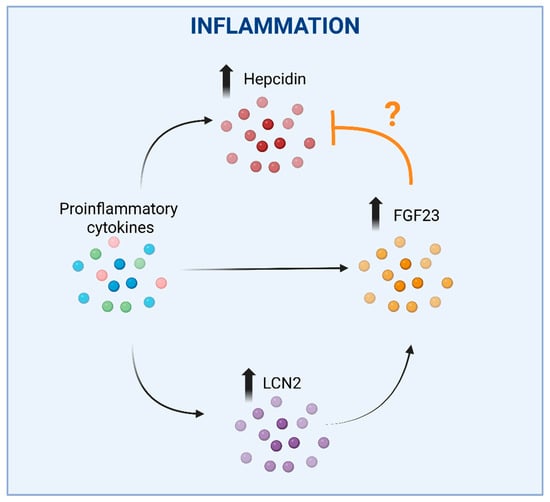 The complex interplay between hepcidin, FGF23 and LCN2 in inflammation. Upregulation of hepcidin by proinflammatory cytokines, which would lead to reduced iron bioavailability, could be counterbalanced by the concomitant stimulation of FGF23 expression, as FGF23 fragments were shown to antagonize BMP-dependent hepcidin synthesis. An additional effect may be represented by the inflammation-mediated direct induction of FGF23 expression. The question mark is justified by divergent data showing that the inhibition of FGF23 elevation led to a reduction in hepcidin. In these settings, LCN2 induction in response to inflammation could represent an additional mechanism increasing FGF23 expression. Faded arrows indicate the increased expression, faded bold vertical arrows indicate increased levels of the corresponding molecules shown, the ‘T-bar’ line indicates an inhibitory effect. Created in BioRender. Correnti, M. (2025) https://BioRender.com/nwvcd99 (accessed on 21 November 2025).