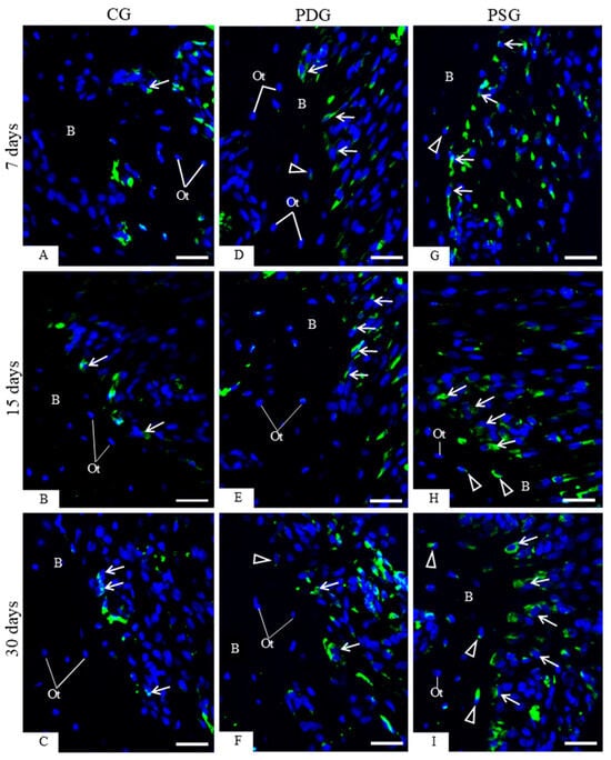 Osteoblasts juxtaposed to the bone surface of the interradicular alveolar process exhibiting ALP activity were observed in specimens of all groups and time points (Figure 8A–I). However, a different pattern in the immunolabelling was noticed among the groups and time points. A marked cytoplasmic immunolabelling was seen in osteoblasts of PDG mainly at 15 and 30 days (Figure 8E,F) in comparison with CG (Figure 8B,C) and PSG (Figure 8G,I) specimens. As shown in Figure 8J, the number of ALP-immunolabelled osteoblasts was significantly greater in the PDG than in PSG specimens (p < 0.0001) at all periods. At 7 days, no significant difference was detected between PDG and CG specimens (p = 0.9948), but the number of ALP-immunolabelled osteoblasts was significantly greater in PDG than in CG specimens at 15 (p = 0.032) and 30 (p < 0.0001) days. In contrast, the PSG had lower values than CG at 7 and 15 days (p < 0.0001), although at 30 days, no significant difference was detected between PSG and CG specimens (p = 0.830). In CG, no significant difference was found in the ALP immunoexpression over time, while in the PDG, a significant increase was observed in the number of ALP-immunostained osteoblasts from 7 to 15 days (p < 0.0001) and from 7 to 30 days (p = 0.0008). In PSG, there was a significant increase in the ALP immunoexpression from 7 to 30 days (p = 0.0094).
