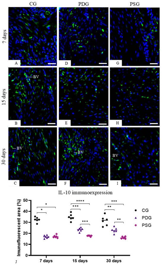 (A–I): Photomicrographs of sagittal sections of portions of maxilla showing the gingival mucosa between first and second molars. The sections were subjected to immunofluorescence for the detection of IL-10 (green color) and nuclear staining with DAPI (blue color). In all groups, cells with immunopositive cytoplasm are observed in the lamina propria of the gingiva. BV, blood vessel. Scale bars: 36 µm. (J): percentage of immunofluorescent area for IL-10 in the lamina propria of the gingival mucosa of CG, PDG and PSG specimens at 7, 15 and 30 days. Graphic shows the individual values (dots) and the median of each group (line). Two-way ANOVA followed by Tukey’s test (p < 0.05). * p < 0.05; ** p < 0.01; *** p < 0.001; **** p < 0.0001. n = 6 specimens per group in each period.