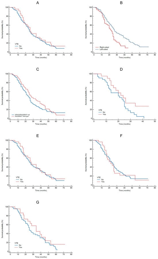 OS according: to VTE (A); to tumor sidedness (B); to oncogene status (C); to VTE in patients with RCRC (D); to VTE in patients with LCRC (E); to VTE in patients with KRAS/NRASmt (F); to VTE in patients with KRAS/NRAS/BRAFwt (G).