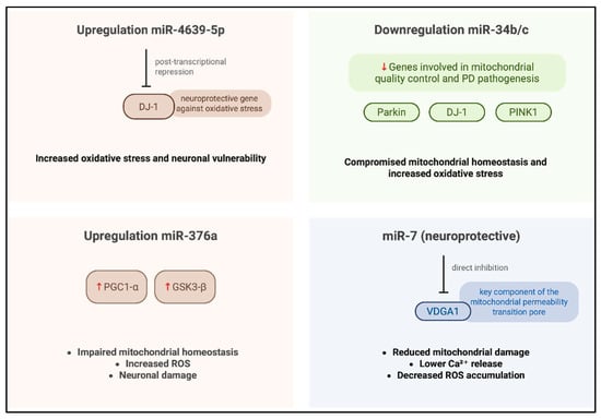 Mito-MiRNA associated with mitochondria ROS imbalance in Parkinson’s disease. Created in BioRender. Colasante, M. (2026). https://BioRender.com/918mtnt (accessed on 25 November 2025).