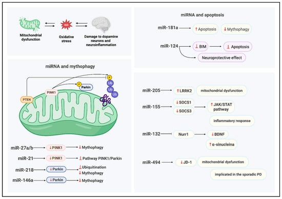 An additional critical pathway in which mito-MiRNA are implicated is mitophagy, the selective autophagic removal of damaged mitochondria [55], which is essential for preserving mitochondrial integrity and sustaining cellular homeostasis (Figure 3); indeed, the clearance of dysfunctional mitochondria is vital for maintaining mitochondrial quality control and ensuring efficient energy production. Disruptions in mitophagy and mitochondrial apoptosis are known to exacerbate the degeneration of dopaminergic neurons [56], which are particularly dependent on intact mitochondrial function for survival and synaptic activity.