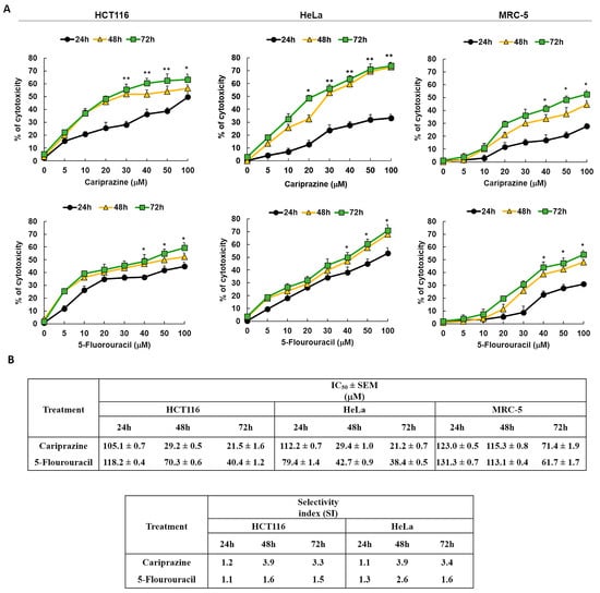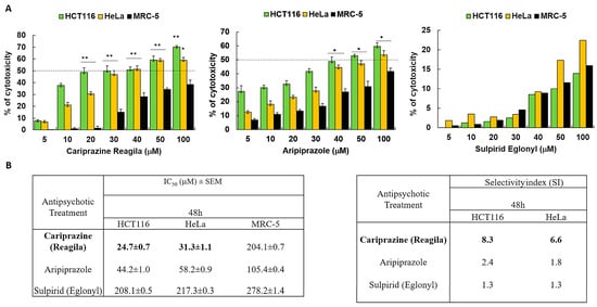 Antipsychotic drugs reduce the viability of HCT116 and HeLa cancer cells. (A) Three different antipsychotic drugs, Reagila (cariprazine), Aripiprazole, and Eglonyl (sulpiride), were administered at varying concentrations (5, 10, 20, 30, 40, 50, and 100 µM) for a duration of 48 h to HCT116, HeLa, and MRC-5 cells. The MTT assay was used to measure the % of cell viability. The dotted line indicates drug’s half maximum inhibitory concentration (IC50). The bar graphs illustrate the mean percentage of cell viability ± SEM (n = 3). * p < 0.05 and ** p < 0.01 indicate statistical significance compared to the control group. (B) The tables present the selectivity index (SI) of the drugs after 48 h of treatment of HCT116 and HeLa cells, along with the mean IC50 (µM) values ± SEM for the tested drugs on HCT116, HeLa, and MRC-5 cells. Cariprizine (bold) was the most cytotoxic to cancerous cells compared to other antipsychotics.