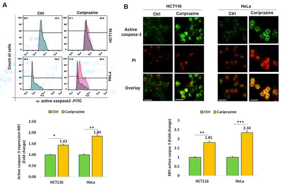 Thereafter, we investigated whether CAR affected cancer cells’ expression of active caspase 3. Figure 5A shows that after 48 h of treatment with CAR (IC50—30 μM), active caspase 3 expression was 1.43- and 1.84-fold higher in HCT116 and HeLa cancer cells, respectively, compared to untreated cells. Immunofluorescence evaluations of caspase-3 activation and cellular localization showed that CAR considerably increased the higher expression (MFI) of active caspase-3 in HeLa cells by 2.34-fold, compared to a 1.81-fold increase in HCT116 cells relative to the control (Figure 5B).