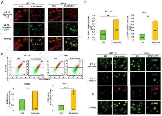 CAR induces changes in mitochondrial membrane potential (ΔΨM) and facilitates the release of cytochrome c in HCT116 and HeLa cells. (A) After 48 h of CAR’s treatment (IC50—30 μM), HCT116 and HeLa cells were labeled with JC-10; (magnification: 40×, 100 μm scale bar). (B) The histogram bars ± SEM show the mean fold change in the JC-10 green/red ratio (n = 3). *** p < 0.001 vs. control group. (C) Immunolocalization of mitochondrial (green punctate) and cytoplasmic (green diffuse) cytochrome c was observed in both control and CAR-treated cancer cells after 48 h. PI red fluorescence increased in dead cells. Bar graphs illustrate the mean ratio of cytosolic (diffuse) to mitochondrial (punctate) mean fluorescence intensity (MFI) of cytochrome c (n = 3). The mean ± SEM is shown by the bars. A significant difference (** p < 0.01). 40× magnification, 100 μm scale bars.