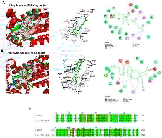 The active and binding site residues of Qi binding pocket in bovine cytochrome bc1 reductase have been identified and validated based on previous studies [30,49]. Using BIOVIA Discovery Studio Visualizer, we examined the crystal structure of cytochrome bc1 reductase in complex with UQ (PDB ID:1NTZ) at a resolution of 2.60 Å (Figure 10A), as well as the crystal structure of the mitochondrial cytochrome bc1 complex bound with Antimycin A1 (Ant A) (PDB ID: 1NTK) at the same resolution (Figure 10B). The Qi binding pocket of cytochrome bc1 reductase comprises essential amino acids that facilitate both the interaction with substrate UQ and the direct catalytic reduction in UQ, including Phe18, Leu21, Ala23, Pro24, Ile27, Trp31, Ser35, Gly38, Met190, Ala193, Met194, Leu197, Leu200, His201, Ser205, Phe220, Tyr224, Lys227, and Asp228 (Figure 10A). Furthermore, the amino acids at the Qi site that interact with the inhibitor Ant A, in addition to the previously mentioned residues, include Ala17, Asn32, Gly34, and Ile42 (Figure 10B). The examination of the sequence alignment between bovine cytochrome b (UniProt P00157) and human cytochrome b (UniProt P00156) showed 83% conservation at the Qi site, as highlighted in green in Figure 10C. Also, the interacting amino acid residues at the Qi site between humans and bovines have a high conservation rate of 90%, which is shown in red boxes in Figure 10C.