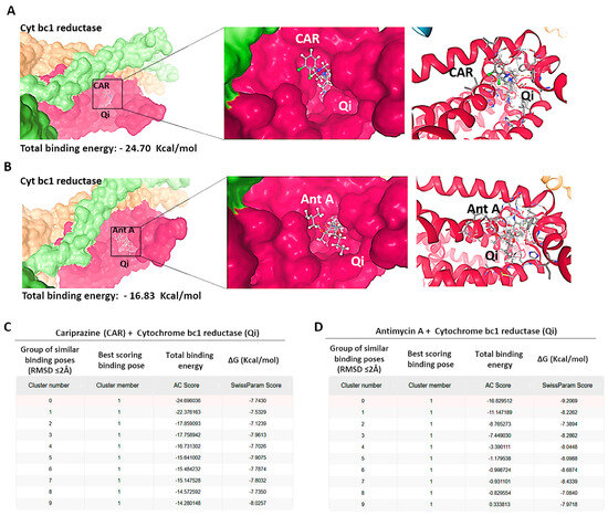 Binding predictions of CAR with the Qi binding pocket of cytochrome bc1 reductase. Molecular docking was conducted utilizing SwissDock 2024, and the structures of the most stable Qi binding site in cytochrome bc1 reductase complexes with (A) CAR and (B) Antimycin A (Ant A) are presented. The predicted total binding affinities are displayed as clusters of analogous poses, ranked according to the AC score (total binding energy), along with the estimated free energies (ΔG) for the binding interactions of (C) CAR with Qi site and (D) Ant A with Qi site.