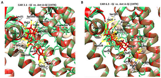 Structural comparison of CAR-Qi and Ant A-Qi complexes. Superimposition of the three-dimensional structures of (A) the CAR 3.1-Qi complex and (B) the CAR 6.3-Qi complex, obtained through molecular docking (red), with the crystal structure of the cytochrome bc1 Qi site bound to Antimycin A (Ant A) (PDB ID: 1NTK) (light green). Yellow dashes indicate the bonds formed between amino acids (white lines) and CAR at the QI site. Superimposition and visualization were performed utilizing UCSF Chimera.