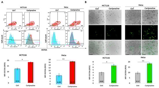 The generation of ROS was assessed through the dichloro fluorescein diacetate assay (DCFDA) (Abcam, Waltham, MA, USA). In summary, Hela and HCT116 cells were exposed to CAR (IC50) over 48 h, and then were washed, trypsinized, and incubated with DCFDA (20 μM) for 30 min in the dark at 37 °C and 5% CO2. An FC500 flow cytometer from Cytomics (Beckman Coulter USA) was used to measure the signals of DCFDA fluorescence distribution. The results are presented as the mean fluorescence intensity (MFI) of DCFDA compared to the control.