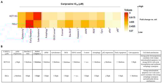 Background/Objectives: Cariprazine (CAR), an atypical antipsychotic drug, exhibits potent anticancer activity; however, its mechanism of action remains unclear. Methods: We conducted a comparison of CAR-induced cell death mechanism in HeLa and HCT116 cancer cells and explored its potential role as a Qi-site inhibitor of cytochrome bc1 reductase (complex III). Results: CAR induced a dose-dependent cytotoxic effect and triggered apoptosis in both cell lines; however, the mitochondrial responses were distinctively different. HeLa cells exhibited significant mitochondrial membrane depolarization, significant cytochrome c release, a strong increase in the Bax/Bcl-2 ratio, elevated caspase-3 activation, and notable S phase arrest along with autophagy induction, indicating that mitochondria-driven apoptosis occurred rapidly. In contrast, HCT116 cells showed moderate mitochondrial dysfunction, moderate cytochrome c release, enhanced suppression of Akt signaling, and significant G0/G1 phase arrest, which are consistent with a slower and mixed apoptotic response. The findings from molecular docking studies predicted that CAR had stable binding at the Qi site and showed interactions at the Qi site that were comparable to those of antimycin A, thereby suggesting its possible inhibitory effect on complex III. Conclusions: The results from our study indicate the engagement of CAR-activated apoptotic pathways that are specific to different types of cancer cells, and hence suggest that CAR may act as a new anticancer drug by potentially directing its action towards the mitochondrial Qi-sites of complex III.