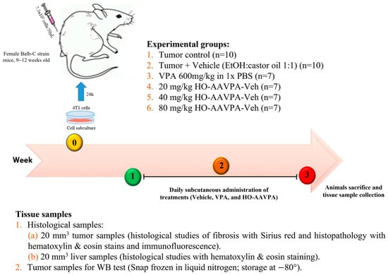 To establish the breast cancer model, 22 female mice were first inoculated subcutaneously with 4T1 cells. After one week, once palpable tumor development was confirmed, animals were randomly allocated into the tumor control (n = 10) and tumor + vehicle (n = 10) groups. During the 22-day observation and follow-up period, the mortality rate associated with tumor progression was recorded. Following completion of this initial phase (21 days), an additional 30 animals were inoculated with 4T1 cells to evaluate the pharmacological treatments. One week after tumor establishment, animals were randomly assigned into the following treatment groups: VPA 600 mg/kg (n = 7), HO-AAVPA 20 mg/kg (n = 7), HO-AAVPA 40 mg/kg (n = 7), and HO-AAVPA 80 mg/kg (n = 7). All treatments were administered once daily for 21 consecutive days.