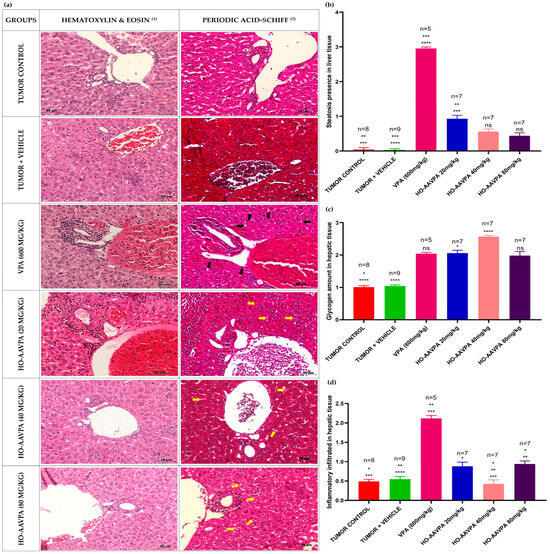 Morphological changes in liver tissue. (a) Representative micrographs showing hepatocyte alterations: column (1) corresponds to hematoxylin and eosin (H&E) staining, showing the general morphology of hepatic tissue; column (2) corresponds to periodic acid–Schiff (PAS) staining, where micro- and macrovesicular steatosis (black arrows) are observed in the VPA-treated group and glycogen deposits (yellow arrows) in the HO-AAVPA 20, 40, and 80 mg/kg groups, evidenced by spaces between the cell membrane and the nucleus. (b) Significant differences were observed in the degree of steatosis, with an increase in the VPA and HO-AAVPA 20 mg/kg groups compared with the control, whereas the HO-AAVPA 40 and 80 mg/kg groups exhibited a marked reduction in steatosis compared with the VPA and HO-AAVPA 20 mg/kg groups. (c) Quantification of glycogen vesicles in liver tissue in response to the treatments. A significant increase was detected in the HO-AAVPA 20 mg/kg and 40 mg/kg groups compared with the tumor control, as well as a significant difference between the tumor + vehicle group and the HO-AAVPA 40 mg/kg group. (d) Differences in inflammatory infiltrate. A significant increase was found in the VPA 600 mg/kg group compared with the tumor control, tumor + vehicle, and HO-AAVPA 40 mg/kg groups; in the HO-AAVPA 80 mg/kg group compared with the tumor control and HO-AAVPA 40 mg/kg groups; and in the HO-AAVPA 20 mg/kg group compared with the HO-AAVPA 40 mg/kg group. Statistical analysis was performed using the Kruskal–Wallis test followed by Dunn’s post hoc test. **** p < 0.0001, *** p < 0.001, ** p < 0.01, * p < 0.05. “n” indicates the number of animals evaluated per group.