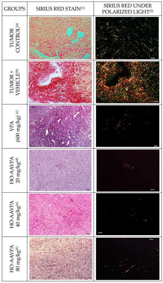 Sirius Red staining revealed a marker reduction in fibrotic area in animals treated with VPA and HO-AAVPA (20, 40 and 80 mg/kg) (Figure 6c–f). In these groups, a noticeably lower number of red-stained fibers was observed in the tissue compared with both the tumor control group (Figure 6a) and the tumor + vehicle groups (Figure 6b). Under polarized light, Sirius Red staining allowed for the visualization of collagen deposits as birefringent, “fluorescent-like” fibers. In the tumor control and tumor + vehicle groups, large and dispersed clusters of collagen fibers with intermediate thickness were evident, with red fibers corresponding to collagen type I and green fibers to collagen type III on a dark background (Figure 6a,b). In contrast, animals treated with VPA (600 mg/kg) and HO-AAVPA (20, 40 and 80 mg/kg) sowed a pronounced reduction in both collagen I and III deposition, with only sparse and thin fiber bundles remaining (Figure 6c–f).