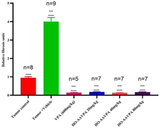 Quantification of fibrosis in experimental groups (relative units). A significant reduction in fibrosis was observed in the VPA and HO-AAVPA treatment groups compared with the tumor control group (**** p < 0.0001; *** p < 0.001). Additionally, all treatments (VPA and HO-AAVPA at 20, 40, and 80 mg/kg) showed significantly lower fibrosis levels compared with the tumor + vehicle group. HO-AAVPA at 20 and 40 mg/kg reduced fibrosis by 8.76- and 8.79-fold, respectively, compared to tumor control. Meanwhile, VPA and HO-AAVPA (20–80 mg/kg) showed reductions of 9.58, 9.65, 9.66, and 9.31-fold, respectively, compared to tumor + vehicle. Statistical analysis was performed using the Kruskal–Wallis test followed by Dunn’s post hoc test. “n” represents the number of animals evaluated.