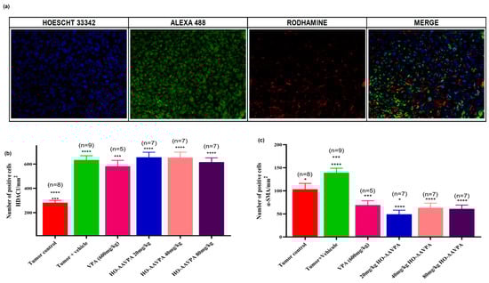 Immunofluorescence analysis of HDAC1 and α-SMA expression in tumor tissue. (a) Nuclei stained with Hoechst 33342; HDAC1 detected with anti-HDAC1-Alexa 488 (green), α-SMA with anti-αSMA rhodamine (red). Images captured at 20× magnification. (b) Quantification of HDAC1-positive cells. (c) Quantification of α-SMA-positive cells. Data are presented as mean ± SD. Statistical analysis: Kruskal–Wallis with Dunn’s post hoc test. **** p < 0.0001, *** p < 0.0005, * p < 0.05. “n” represents of animals evaluated.