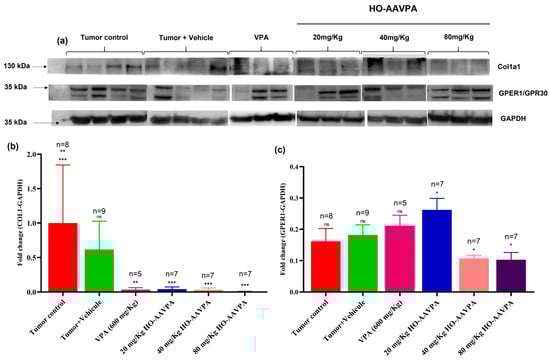 The GPER1 plays a crucial role in tumor cell metastasis and invasiveness, as well as in the survival of BC patients [62]. We assessed the expression of COL1A1 and GPER1 in induced tumor tissues (Figure 9a). The Western blot results indicated that HDACi treatments significantly down-regulated COL1A1 expression (Figure 9b). Regarding GPER1, its expression was more significantly decreased following treatment with 40 and 80 mg/Kg HO-AAVPA than the 20 mg/Kg and 600 mg/Kg treatments, but not compared to the remaining groups (Figure 9c).