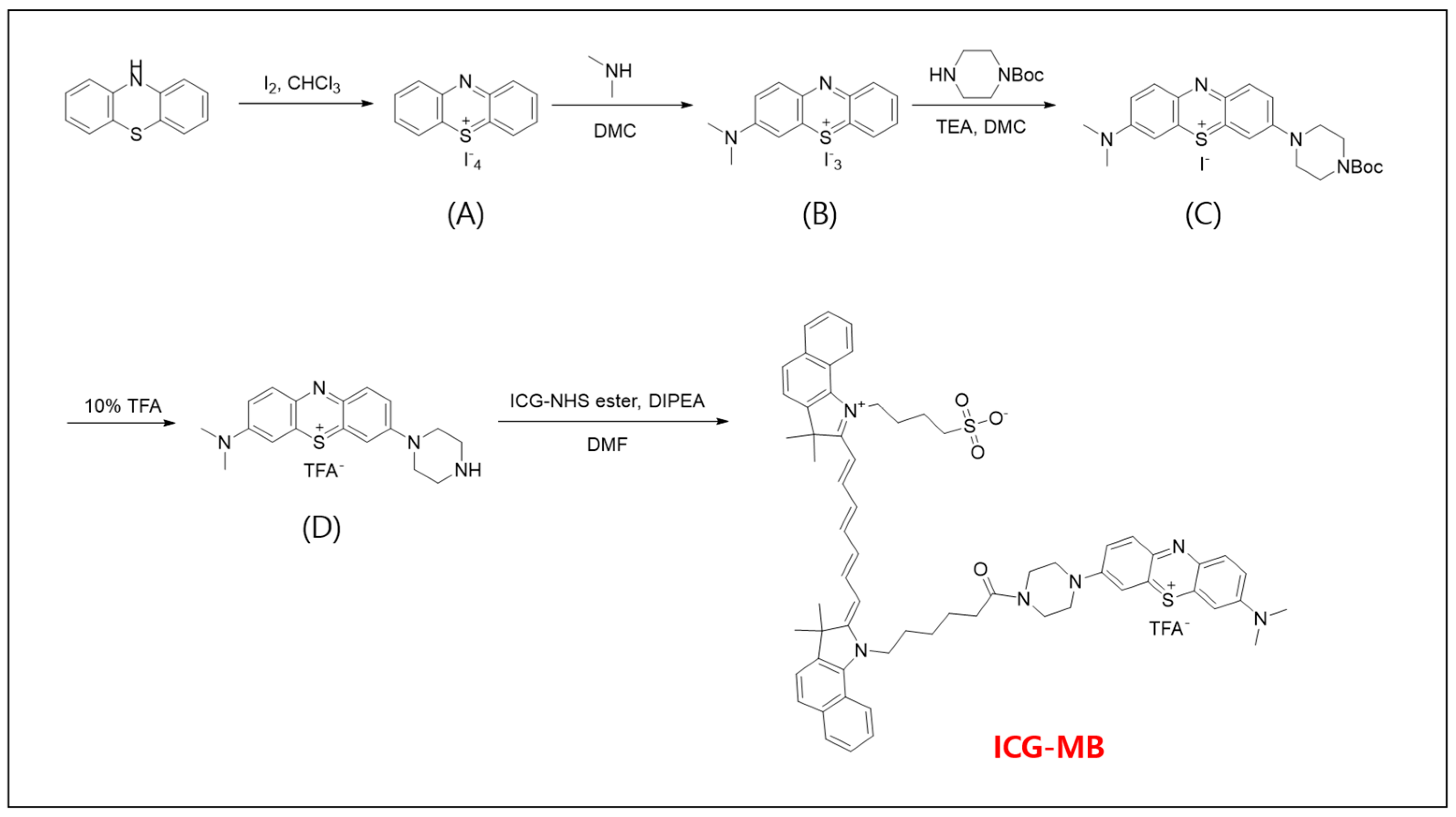 The overall synthetic route afforded ICG–MB in 83% isolated yield in the final coupling step, following intermediates A–D with yields of 95%, 55%, 75%, and 99%, respectively.