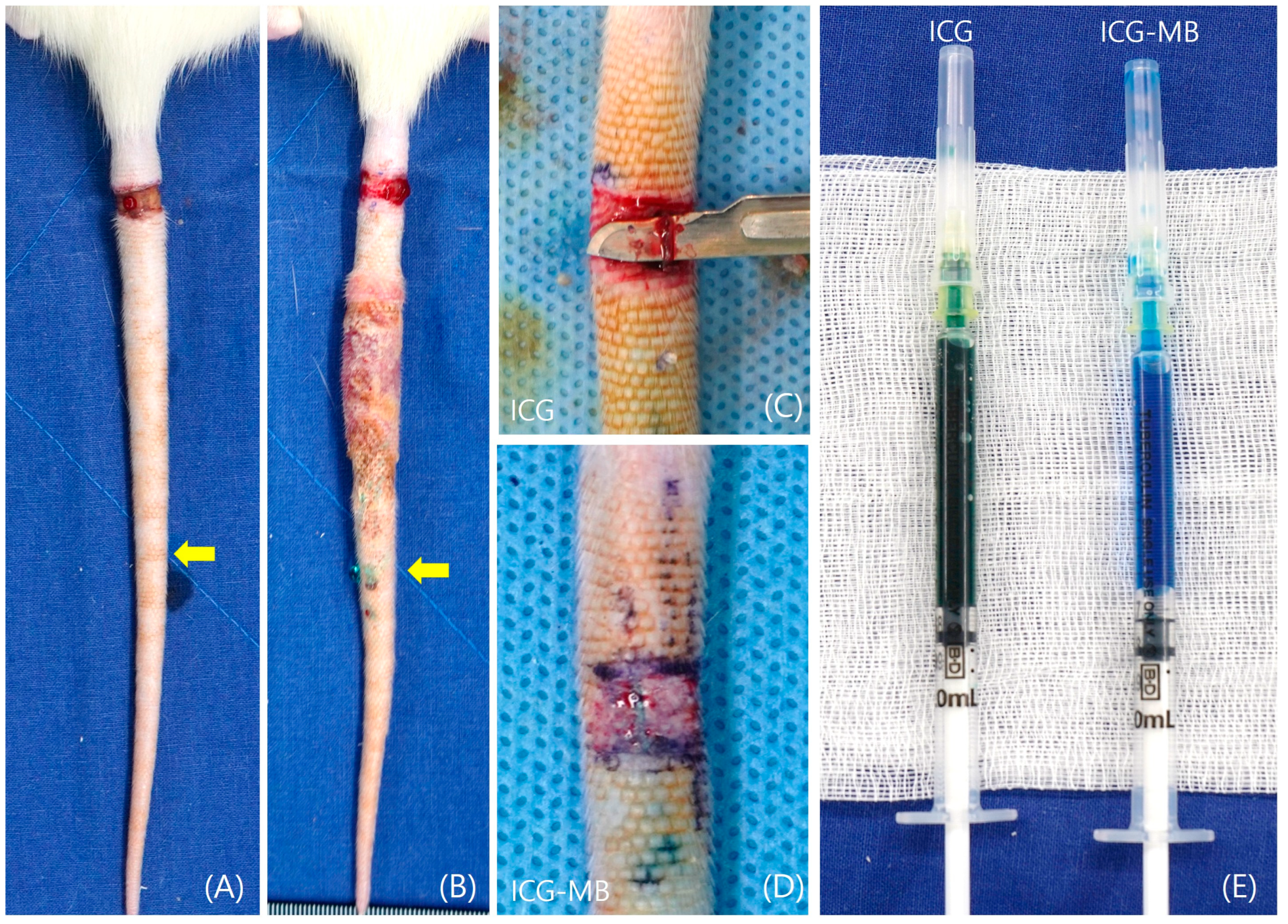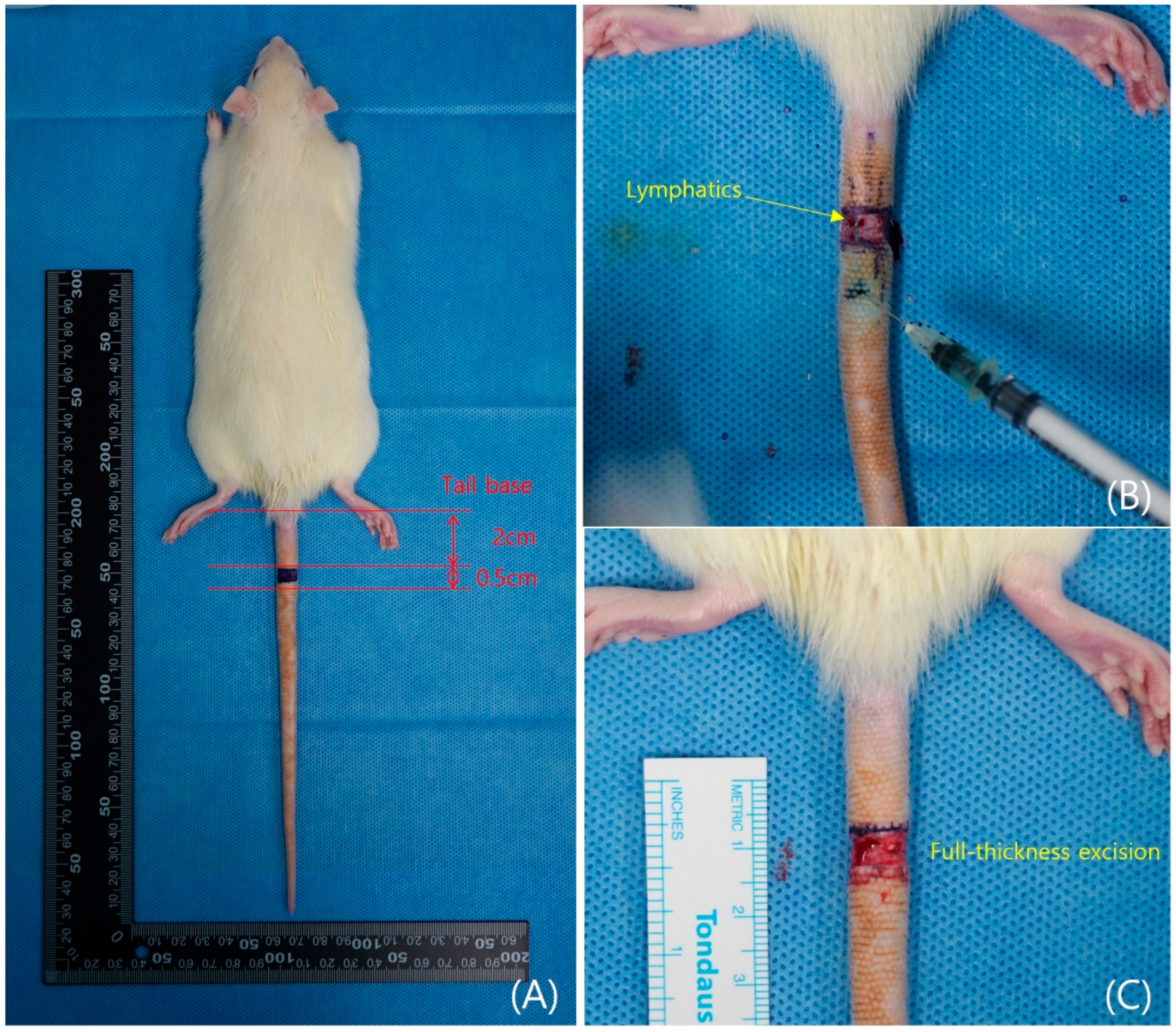 ®, Bayer, Leverkusen, Germany). The experimental animals were monitored for respiration and anesthesia status, and subsequently, their tails were disinfected three times with alcohol and a 10% povidone solution. To disrupt the superficial lymphatic vessels, a 5 mm-wide full-thickness section of skin was excised 20 mm from the base of the tail in all rats. To remove the deep lymphatic vessel running parallel to the lateral tail vein, ICG (Diagnostic Green LLC, Farmington Hills, MI, USA) was injected subcutaneously to visualize the vessel’s course. The deep lymphatic vessel was carefully excised using a No. 15 surgical blade. Care was taken to avoid vascular injury during lymphatic excision. The incision site was covered with 3M