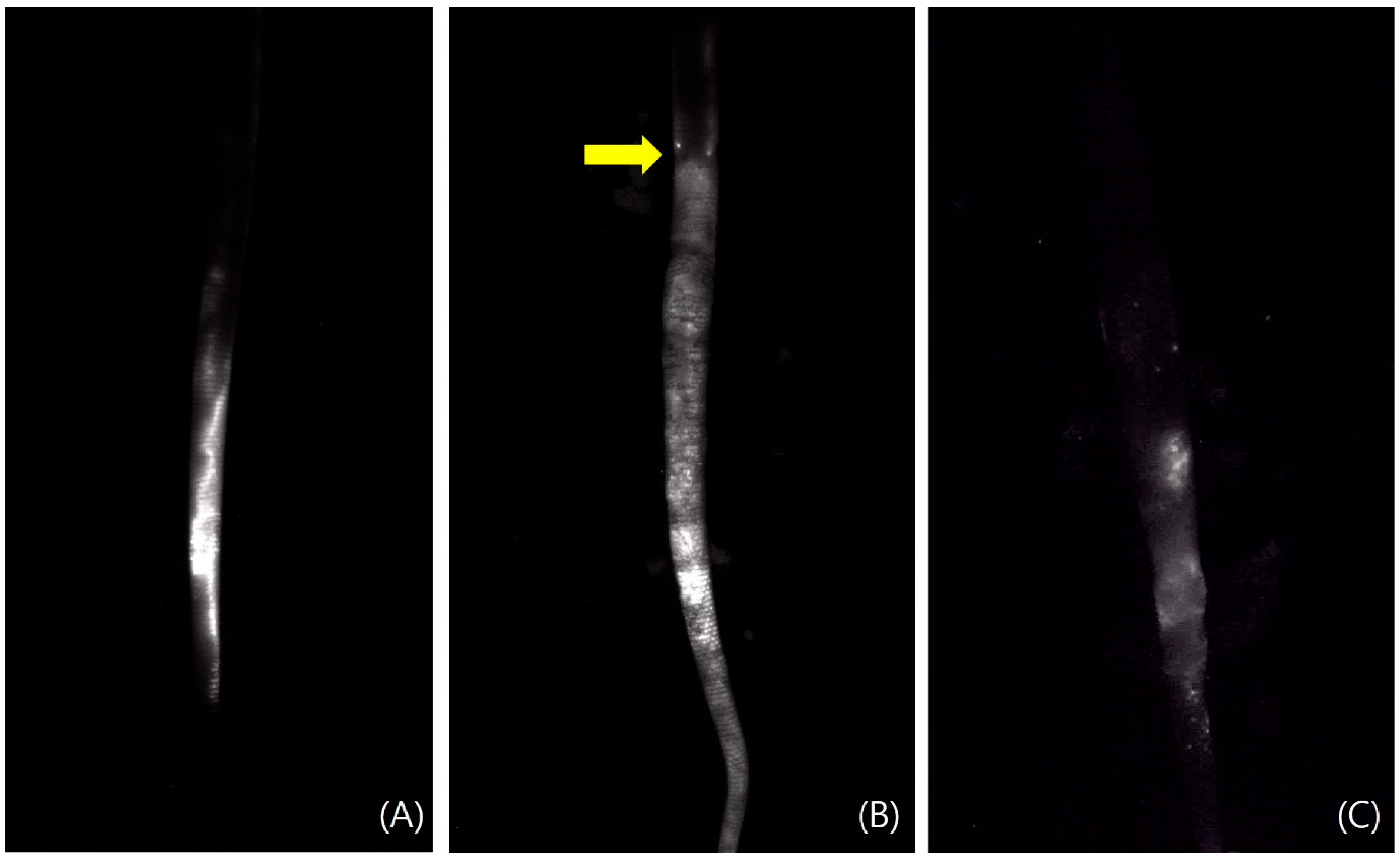 Overall, 10 μL of ICG reagent was injected subcutaneously at a point 30 mm from the tail tip in five rats, and 10 μL of the prepared ICG-MB reagent was injected at the same location in the remaining six rats. Five minutes after injection, lymphatic flow at the surgical site was imaged using the SPY Elite® Fluorescence Imaging System (Stryker Corp., Portage, MI, USA) at the Preclinical Research Center of K-Medi Hub.