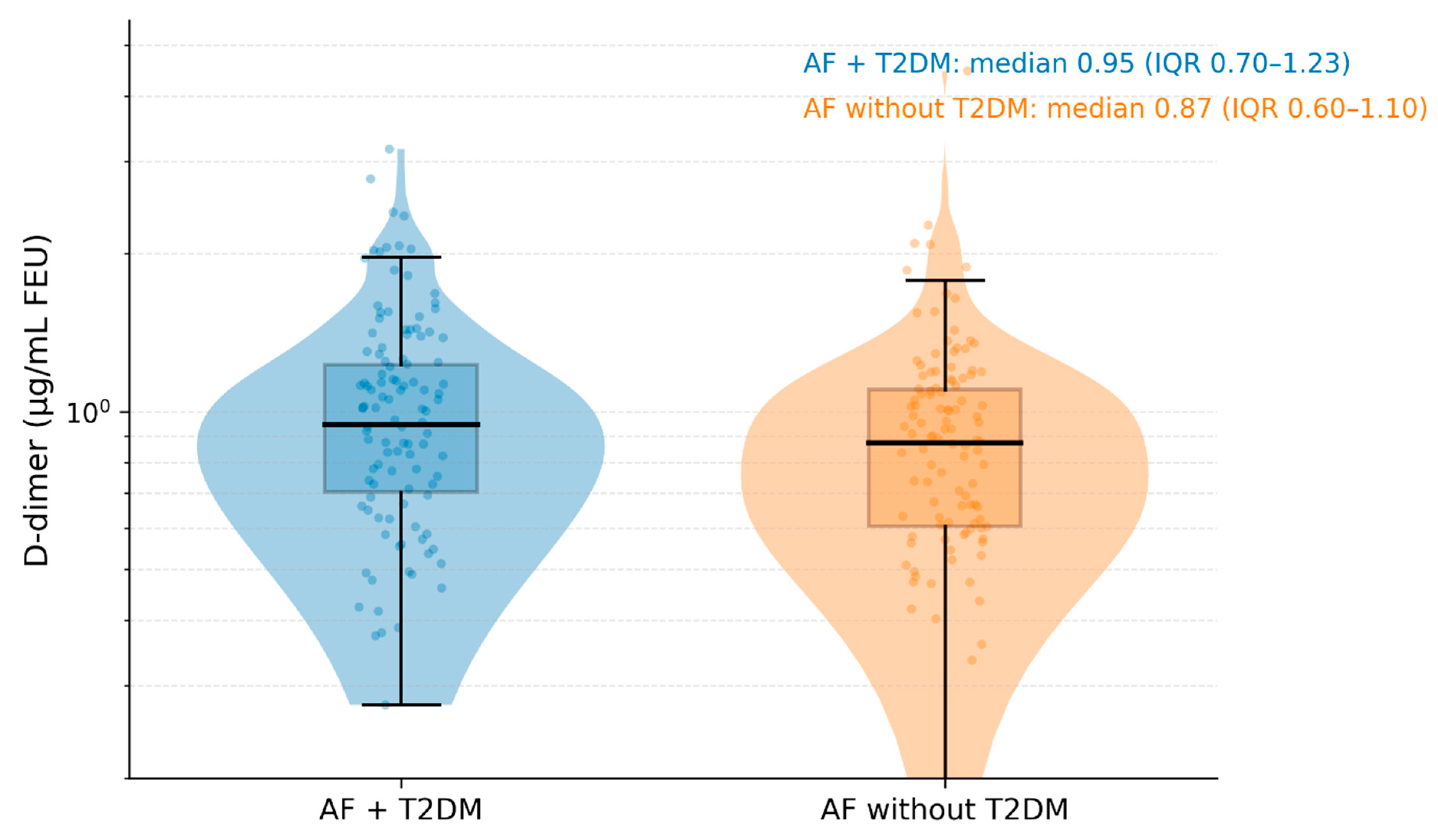 | Logistic regression | D-dimer > 1.0 µg/mL FEU | T2DM (yes vs. no) | OR = 2.07 | 1.24–3.47 | 0.005 |