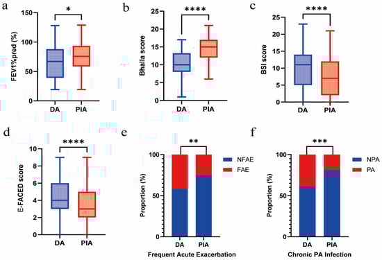Compared with patients in the PIA group, those in the DA group exhibited a lower FEV1%pred (p = 0.010) and Bhalla score (p < 0.001) and a higher BSI score (p = 0.003) and E-FACED score (p < 0.001). In addition, they showed more frequent acute exacerbations (p = 0.002) and a significantly higher prevalence of chronic PA infection (p < 0.001) (Figure 2a–f).