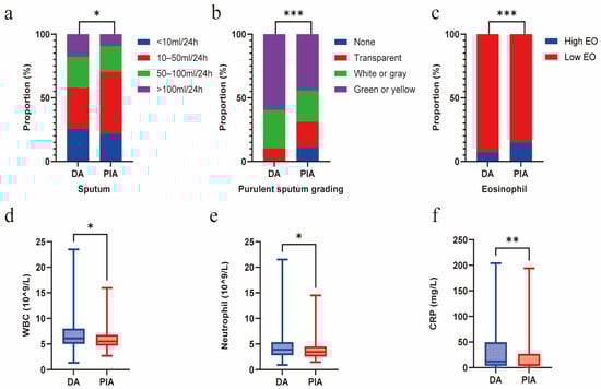 Radiological phenotypes correlate with mucus burden and inflammation. (a) Comparison of sputum volume between DA and PIA phenotypes. (b) Comparison of purulent sputum grading between DA and PIA phenotypes. (c) Comparison of eosinophil levels between DA and PIA phenotypes. (d) Comparison of WBC count between DA and PIA phenotypes. (e) Comparison of neutrophil count between DA and PIA phenotypes. (f) Comparison of CRP levels between DA and PIA phenotypes. (* p < 0.05; ** p < 0.01; *** p < 0.001).