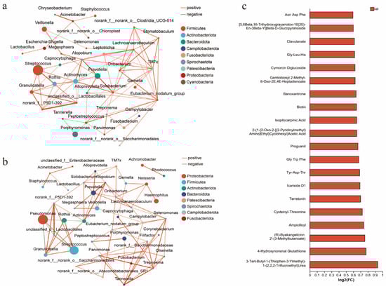 Radiological phenotypes correlate with microbiota and metabolites. (a) Interrelationships of airway microbiota in the DA phenotype. (b) Interrelationships of airway microbiota in the PIA phenotype. (c) Association between radiological phenotypes and metabolites. The bar plot shows metabolites upregulated in the DA group compared with the PIA group. FC (fold change) represents the ratio of metabolite abundance in the DA group relative to the PIA group, presented as log2-transformed fold changes [log2(FC)]. Up denotes metabolites that are increased in the DA group.